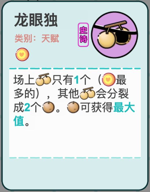 1、新增显示开启无限模式的进度条; 2、新增天赋,龙眼独:场上只有一个龙眼,其余会分裂成2个桂圆。该桂圆可获得最大值。(感谢玩家 提供的想法); 3、龙眼又双叒叕调整:每+5永久收益添加桂圆,每多5+20%永久收益,添加数量+1; 4、桂圆半衰期由4季调整为3季; 5、调整复制的桂圆也可随机收益;(标本可以多利用下) 6、修复胡萝卜对新添加的兔不起作用;(养胡萝卜,加强兔,然后锅姨的锅翻倍,大家#攻略