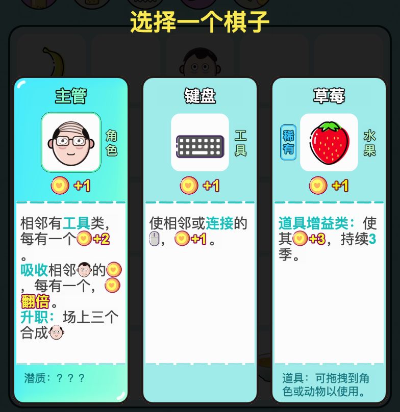 每一个棋子都有潜质,创造更多可能! 不同于天赋会影响同一种所有棋子,潜质只对单个棋子起作用,丰富获拓展其功能。 潜质分为普通潜质和专属潜质。普通潜质大部分棋子都能获得;专属潜质,只属于该种棋子才能获得。 普通潜质: 撒币:给相邻棋子+10收益。 成长:每次结算后永久+1。 膨胀:初始倍数为10。 共享:跟相邻共享额外收益。 吞噬:吸收一个品质低的相邻棋子。 专属潜质: 【老板】传说以下相邻棋子皆可
