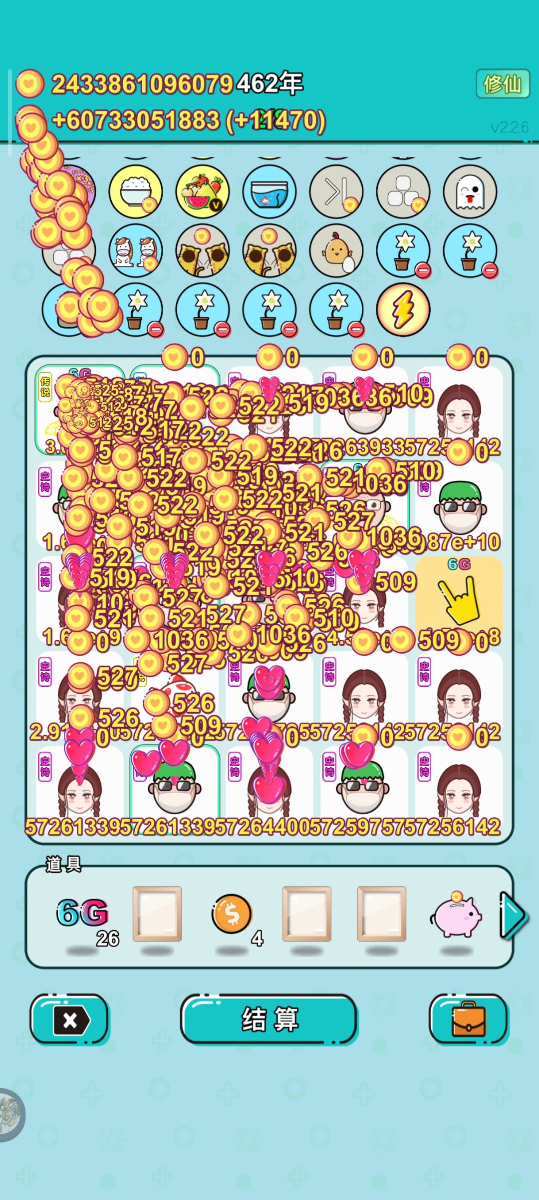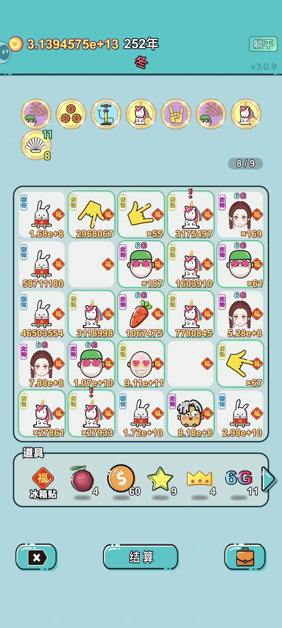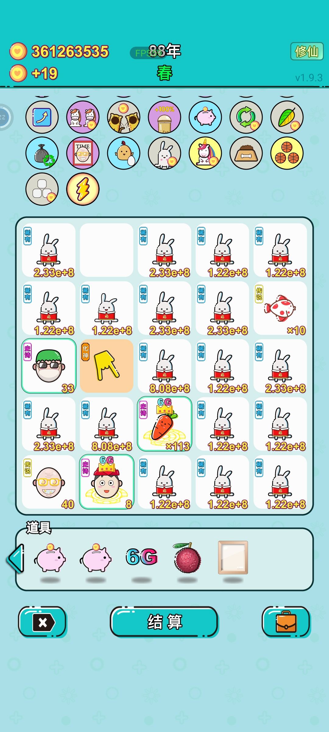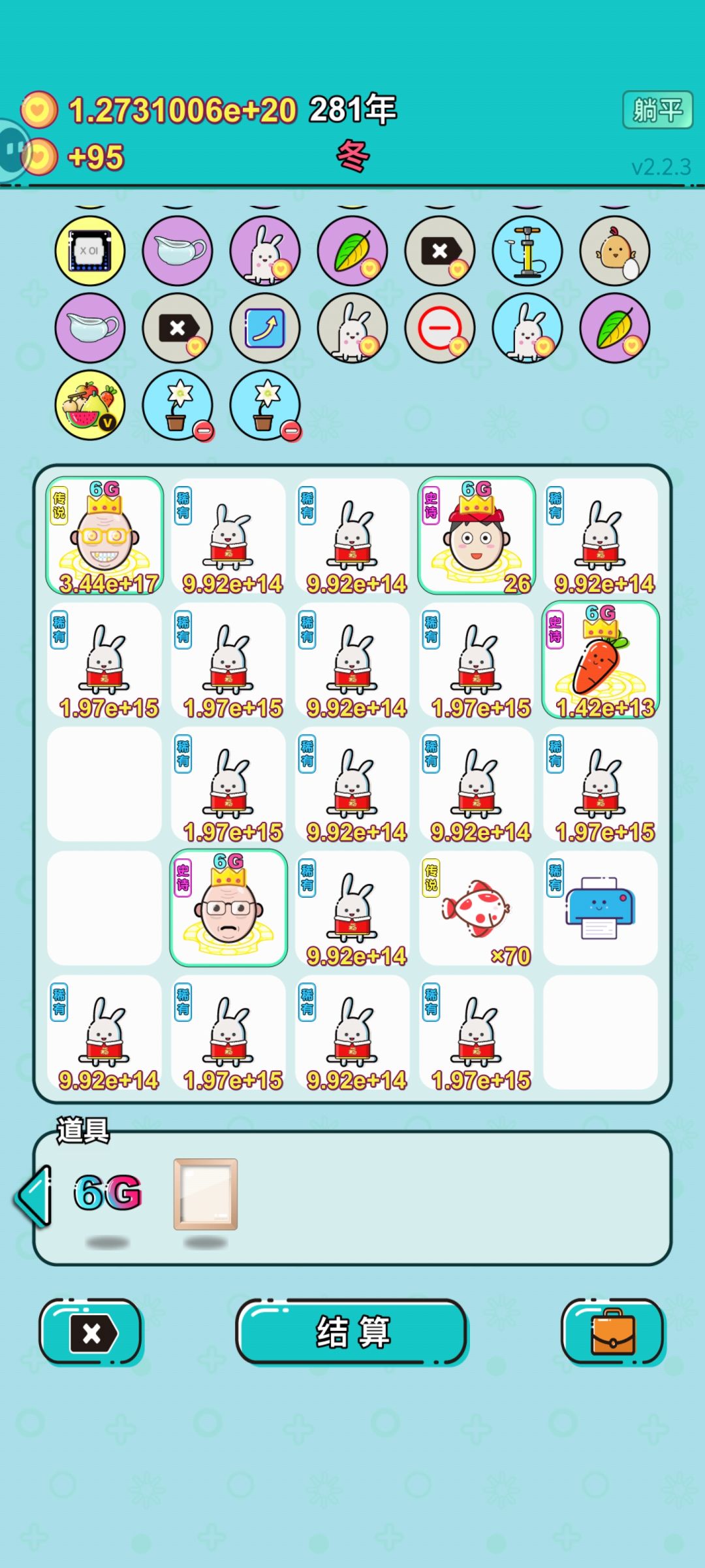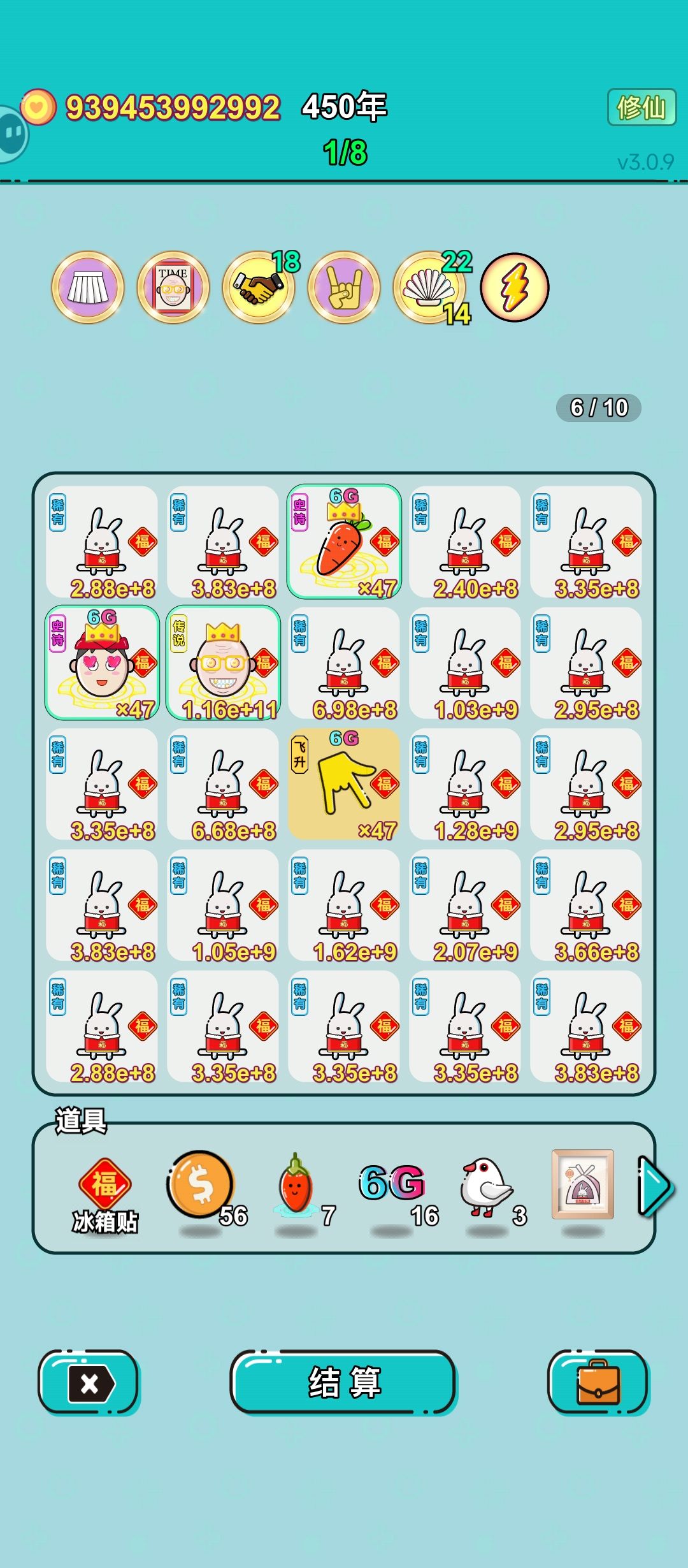 潜质胡萝卜可以吸收繁殖过的兔子,并把自己的钱加在兔子上。 饲养员可以翻倍动物。 6G可以与所有相邻。 修仙手指在翻倍。 只要手指指向“胡萝卜”或者“饲养员”就是满屏幕的钱(兔子钱+胡萝卜额外钱)×饲养员×金手指