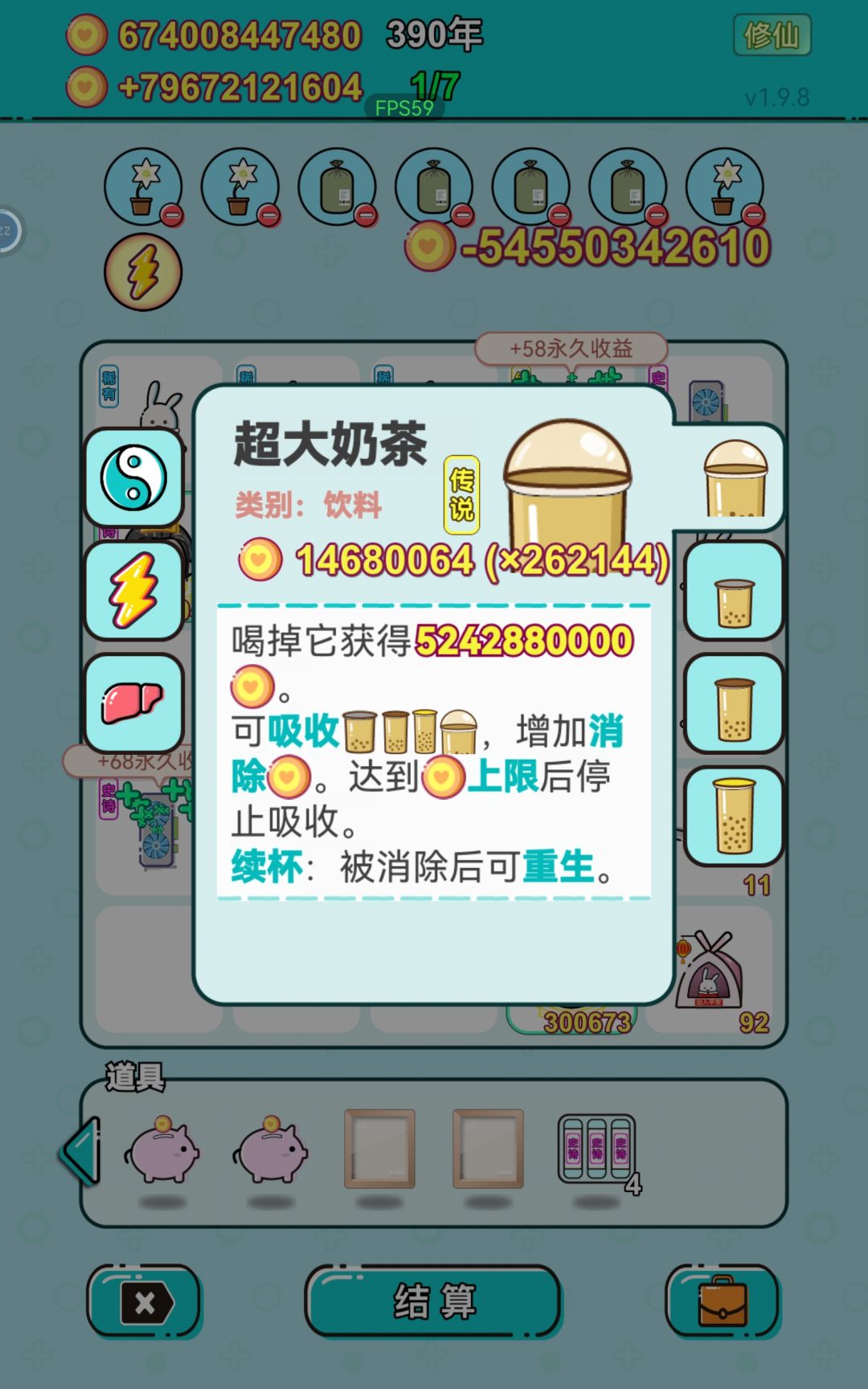 缺点是,奶茶莫名其妙难飞升,开了好几次都这样 优点比较稳,如果想保险,就前期先合首富戴皇冠,再用郭姨 技巧就是堆天赋,奶茶天赋难刷,囤相框,框住天赋盲盒,然后用六个复制,反复刷