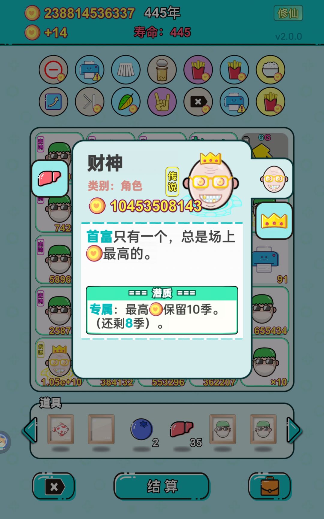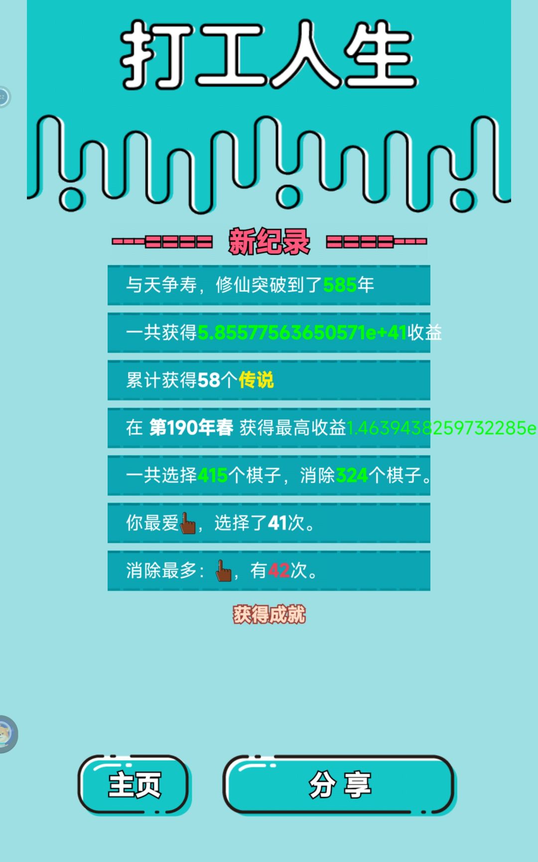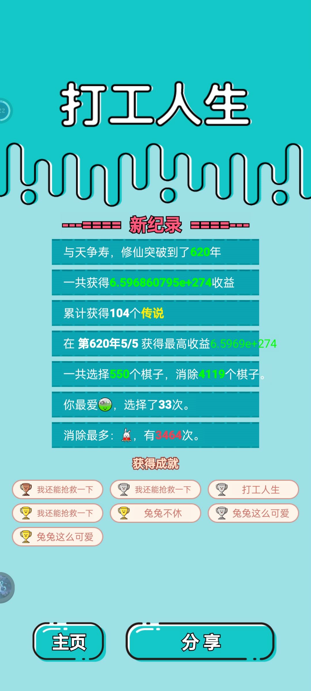 我虽然没有过600年,但是过600年真的很容易,只要你不是修仙70成功率的情况也能失败两次的运气。如图,最高单次结算实际超过了40次方,最高一次没截上,我这把真是运气太差了,经历过40年前一个6g没有,经历过中期首富被劈死,经历过三个潜质老板合成第二个首富被噶了,还好后期刷到了首富一直在场的天赋(108年刷到的,运气也是有点差),经历过60,70成功率修仙失败共两次,始终没刷到增加6g上限的天赋,