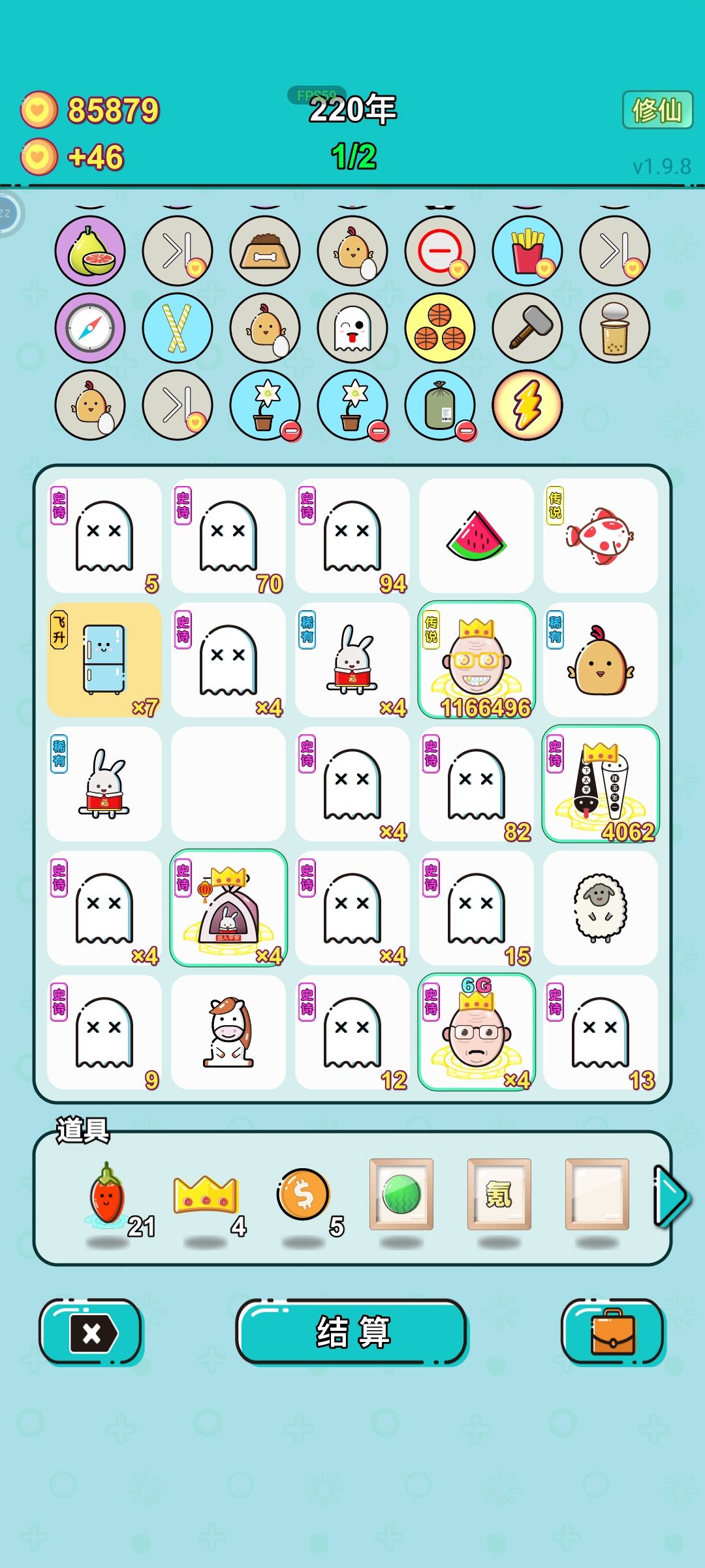 之前说过的布局:老板拿鬼的钱,无常淘汰便宜鬼,首富翻倍最高收入,这次换了冰箱来修仙,框着西瓜复制/狼吃羊拿杨桃,钱很快满,肝则不太够,用到氪棋,也是框+复制作弊,冰箱一次还能喂上10个蓝莓 这局输在没刷到6G,3个锦鲤概率差不多了,后面要冒险开盲盒和盒子,狼王不能无敌,早点准备6g屠夫更好,有潜质的就加冕吧,开盒期攒移除比刷新有用,天赋也可以多选抽棋子