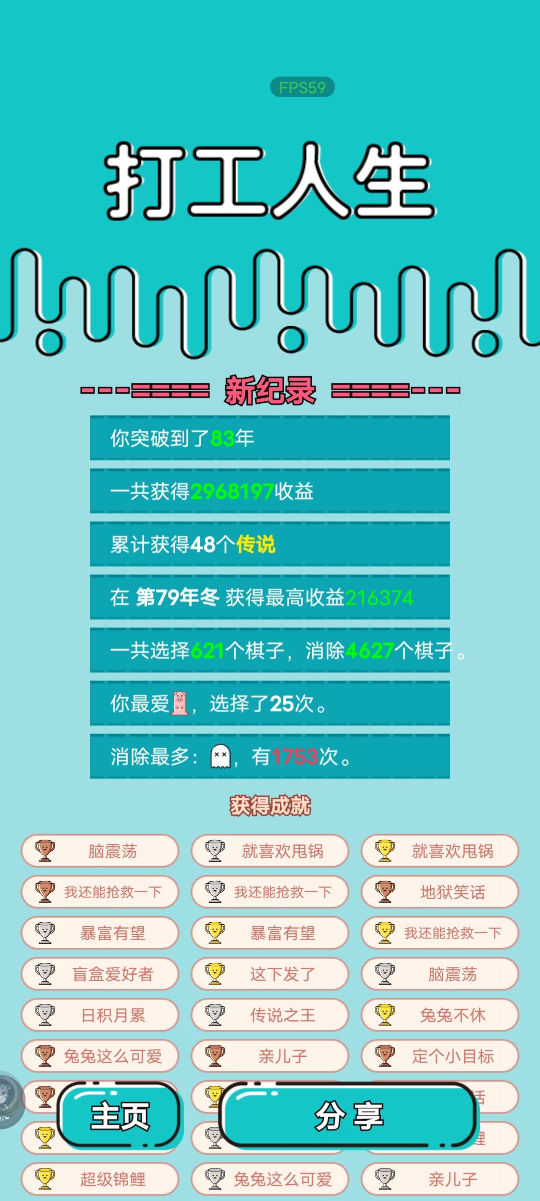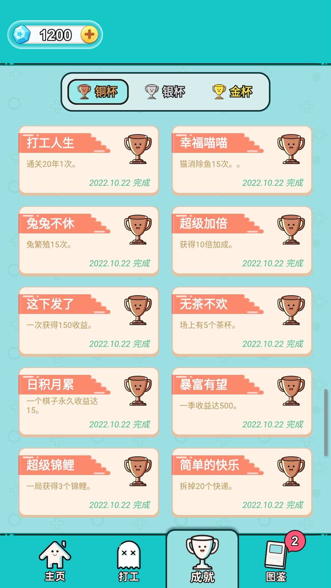 绝大多数成就好像都是有三个杯,触发铜杯之后显示银杯,银杯完成后显示金杯。有一些成就只有一个杯,可能是特殊成就 (一)有三个杯的 ①打工人生 通关20年1/10/?次 ②幸福喵喵 猫消除鱼15/30/50次 ③兔兔不休 兔繁殖15/30/100次 阵容带兔窝,胡萝卜,屠夫,饲养员,icu,6g,顺便可以拿日积月累,暴富有望,我还能抢救一下,这下发了 ④超级加倍 获得10/15/20倍加成 阵容带金手