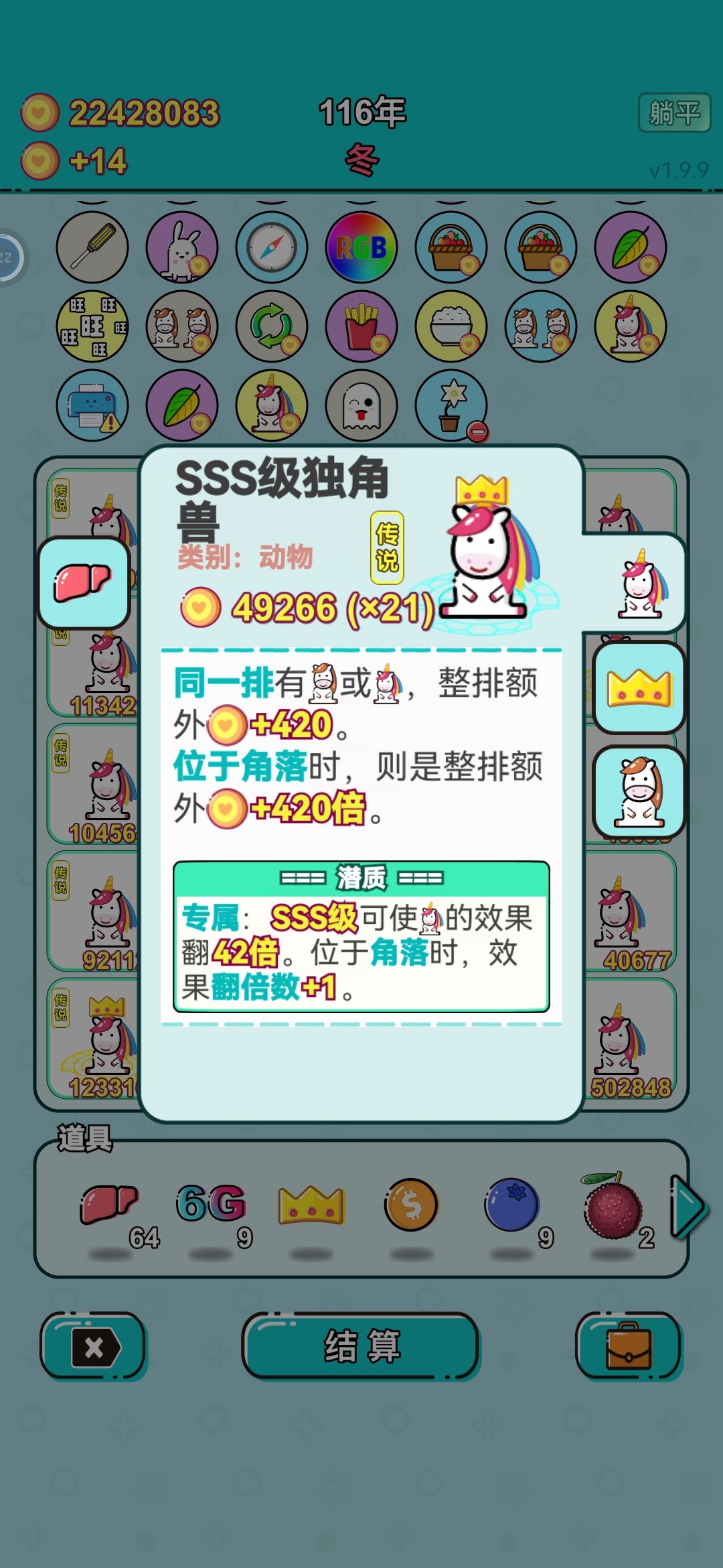 潜质1024倍的狼王还是有点意思 潜质sss独角兽给我整懵了,把普通独角兽全吞了,幸好潜质繁殖的兔子给力,又给繁殖回来。 要是全是sss独角兽还是有看头的,但太肝了,而且后期还是有点不给力
