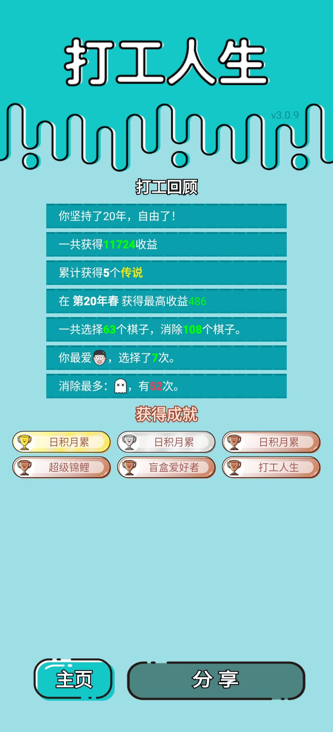我打工坚持了20年。共获得11724收益。累计获得5个传说棋子。共选择63个棋子,消除108个棋子。获得了6个成就!#单机游戏 #游戏推荐