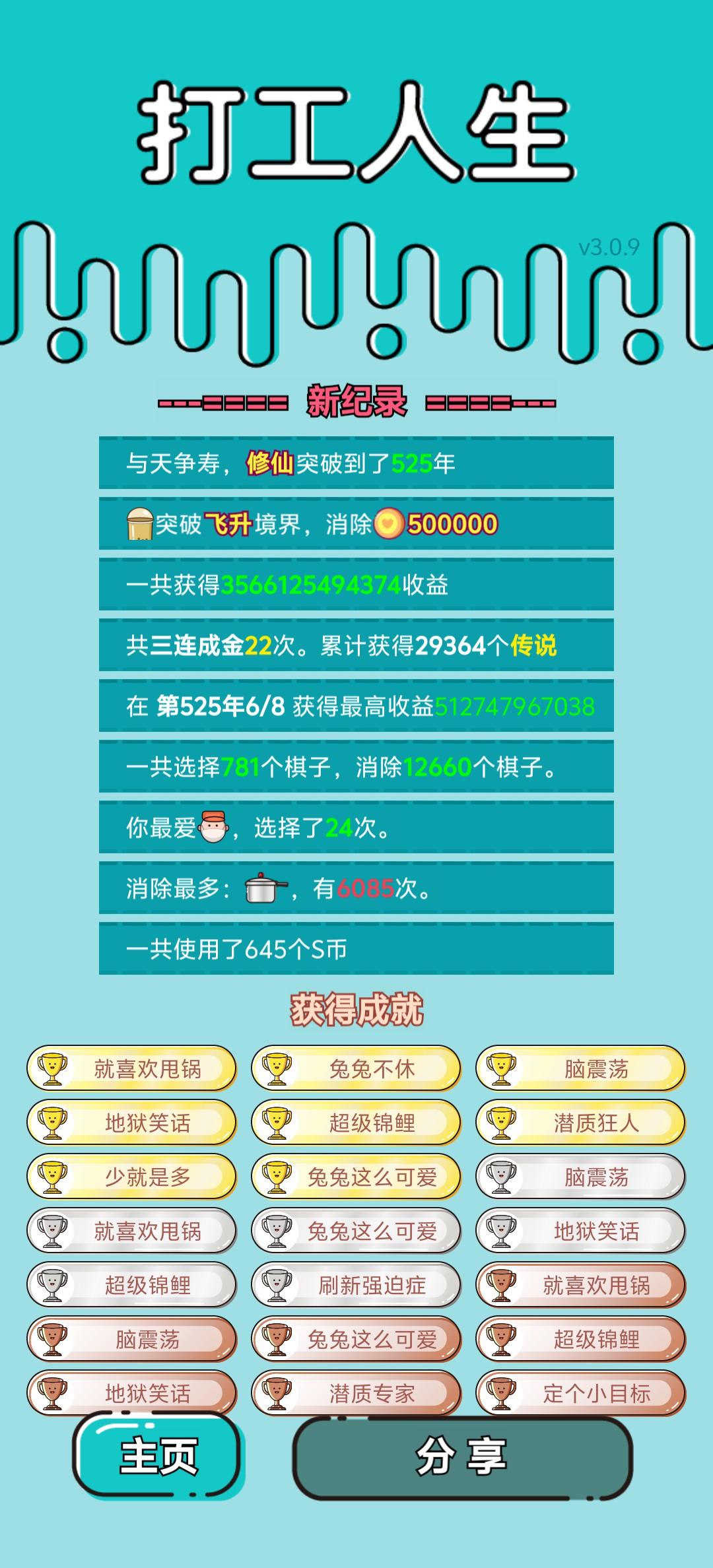 我打工坚持了525年。共获得3566125494374收益。累计获得29364个传说棋子。共选择781个棋子,消除12660个棋子。我最爱清洁工,选择了24次。获得了21个成就!#单机游戏 #游戏推荐