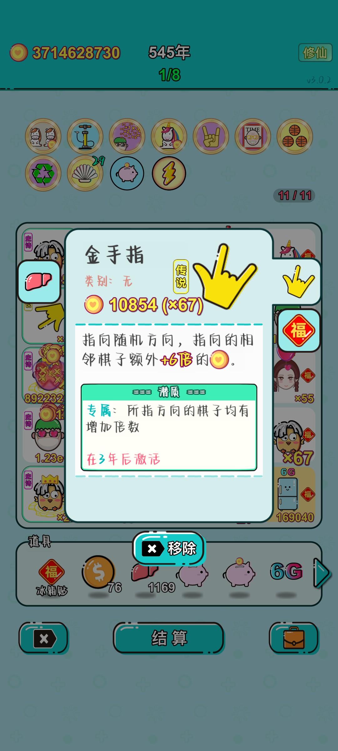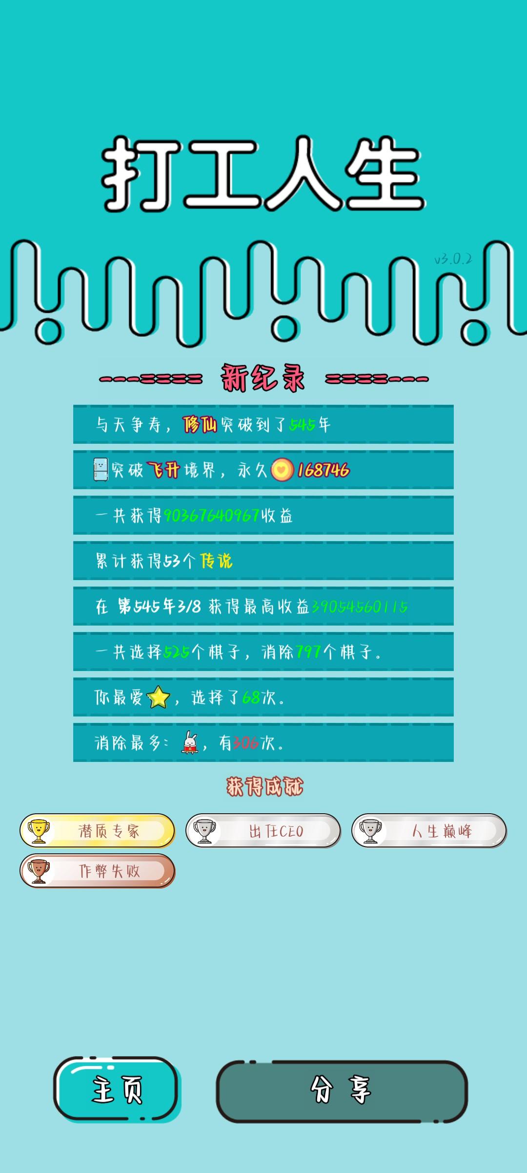 我打工坚持了545年。共获得90367640967收益。累计获得53个传说棋子。共选择525个棋子,消除797个棋子。我最爱杨桃,选择了68次。获得了4个成就!#单机游戏 #游戏推荐