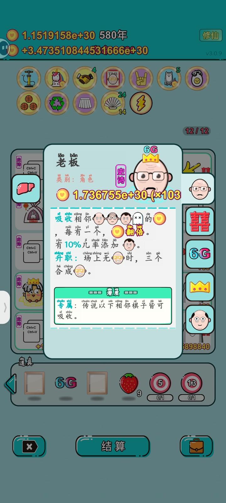 1、修复6G结算次数有误;2、现在回收的6G,在道具栏的可另外叠加在一起;3、现在被消灭的棋子,不再回收其6G;4、调整首富有继承效果:消灭其他首富+5永久收益;5、新增传说天赋【收购】:首富的继承可获得被消灭首富5%的永久收益;6、修复打印机完美复制后,同时存在多个首富的问题;7、修复打印机复制有潜质的棋子,可能导致报错的问题;8、修复一些问题。