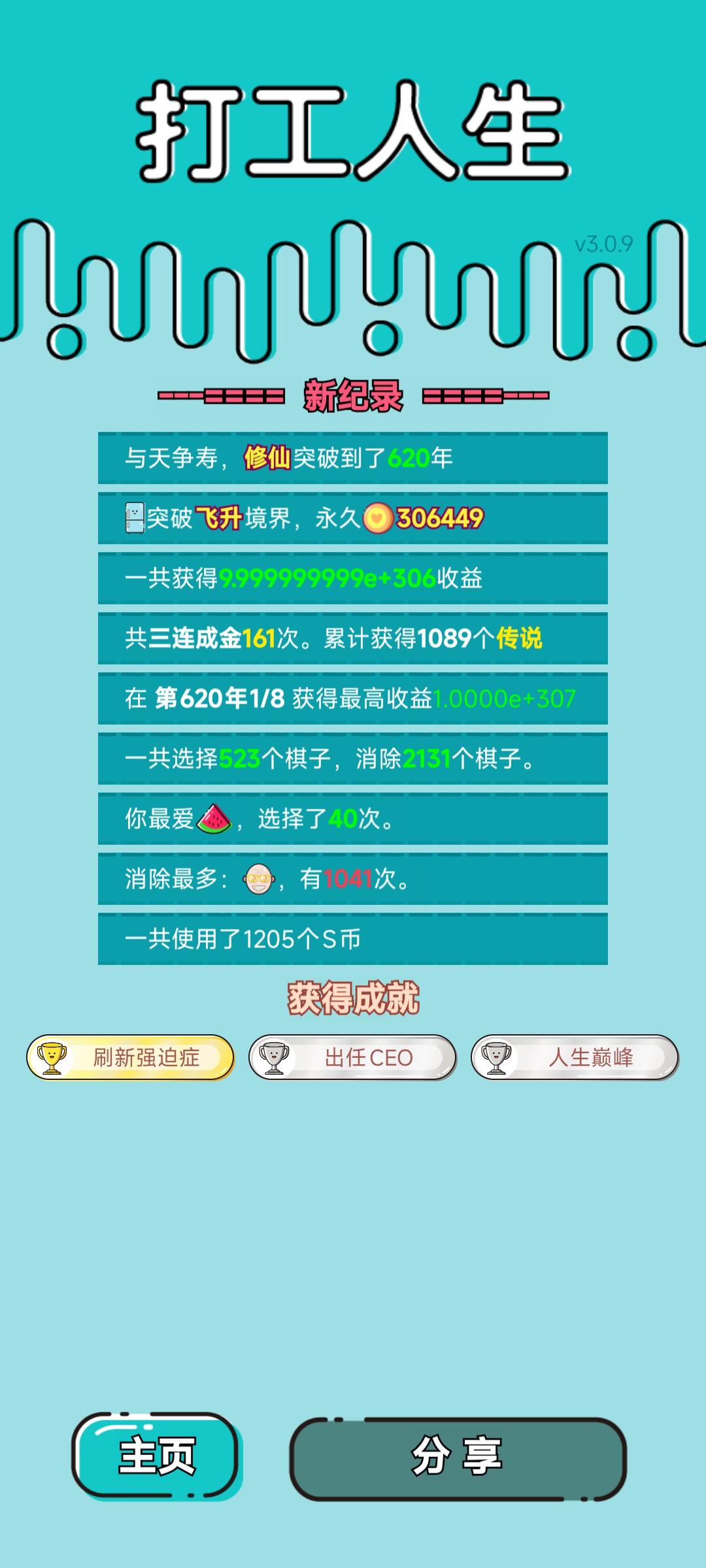 我打工坚持了620年。共获得9.999999999e+306收益。累计获得1089个传说棋子。共选择523个棋子,消除2131个棋子。我最爱一块西瓜,选择了40次。获得了3个成就!#单机游戏 #游戏推荐