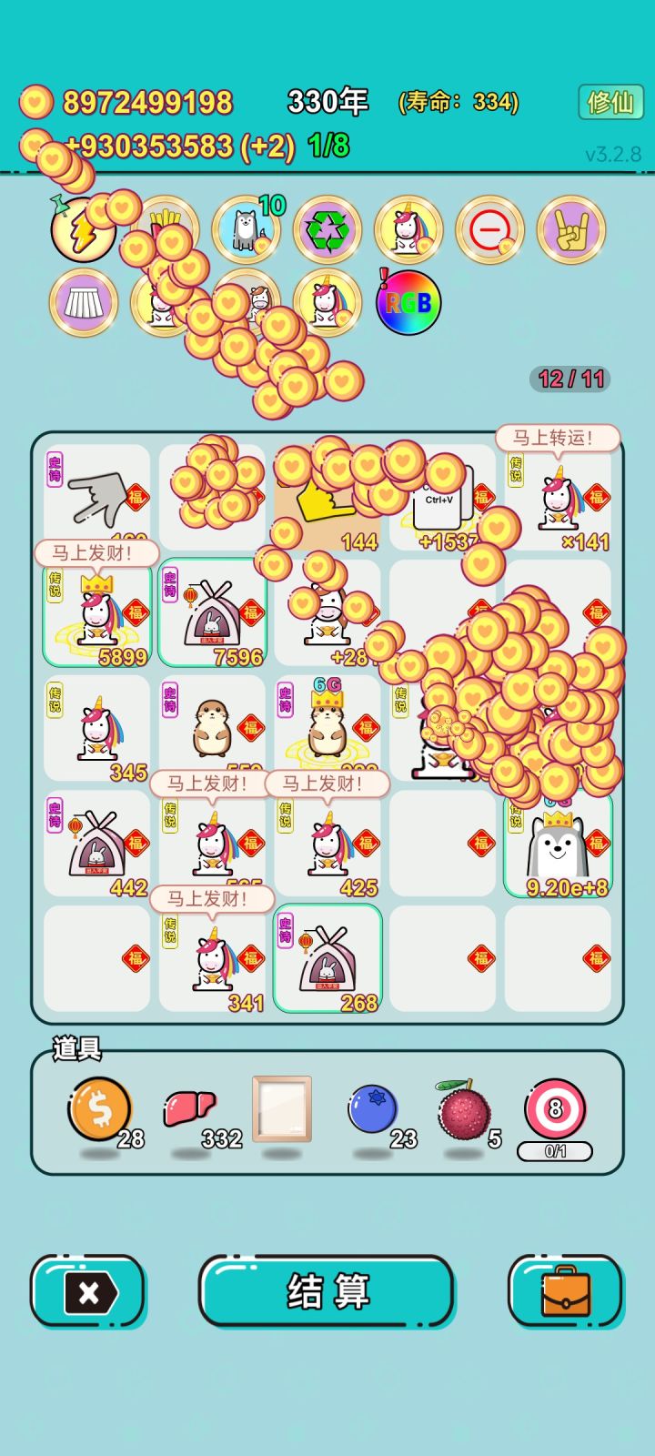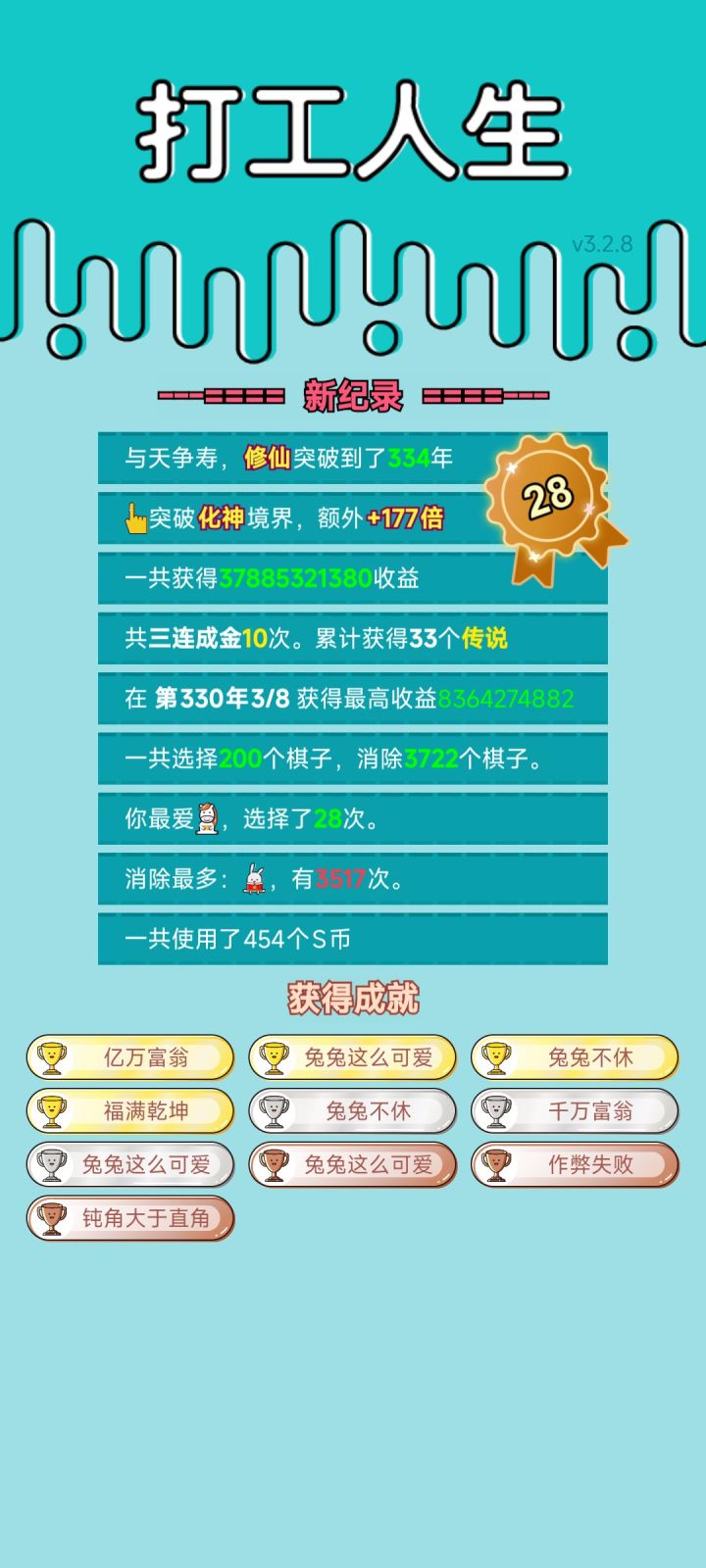 我打工坚持了334年。获得了第28名。共获得37885321380收益。累计获得33个传说棋子。共选择200个棋子,消除3722个棋子。我最爱马,选择了28次。获得了10个成就!#单机游戏 #游戏推荐