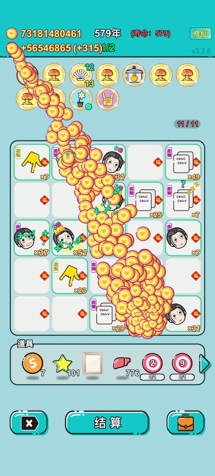 我打工坚持了579年。获得了第3名。共获得338190809159收益。累计获得23073个传说棋子。共选择663个棋子,消除13565个棋子。我最爱猪,选择了38次。获得了7个成就!#单机游戏 #游戏推荐