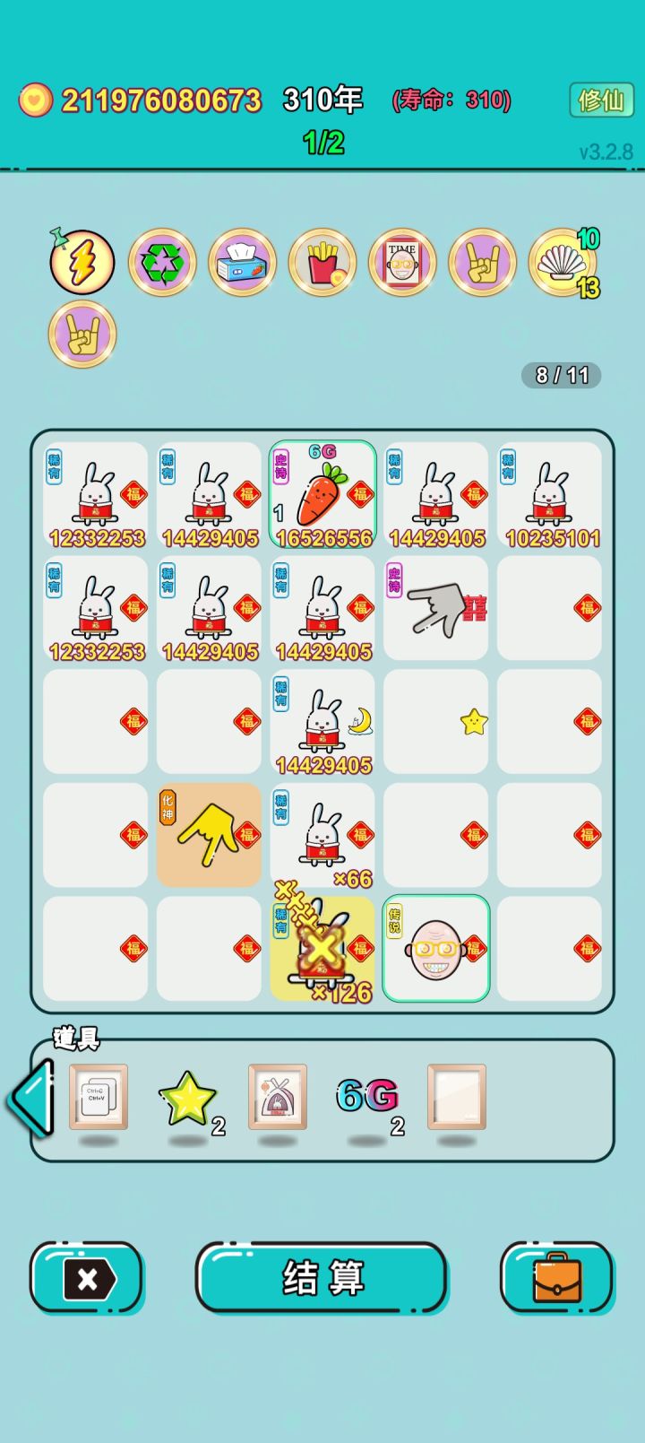 1、新增天赋【纸巾】:手指指向专属潜质的胡萝卜时,使其翻倍概率+10%,翻倍后重置;2、金天赋【纸巾】还会在商店添加一个锁定的专属天赋胡萝卜;3、优化胡萝卜和兔子对福的多次效果,更容易吸收和繁殖;4、新增蜜柚潜质:相邻蜜柚获得结算收益时,有20%几率结算收益+20%,至少+1;5、调整蜜柚:每4~8次结算,收益永久+1~5,数值范围在下一次上场时确定;6、现在初始的5个,调整为3个固定出