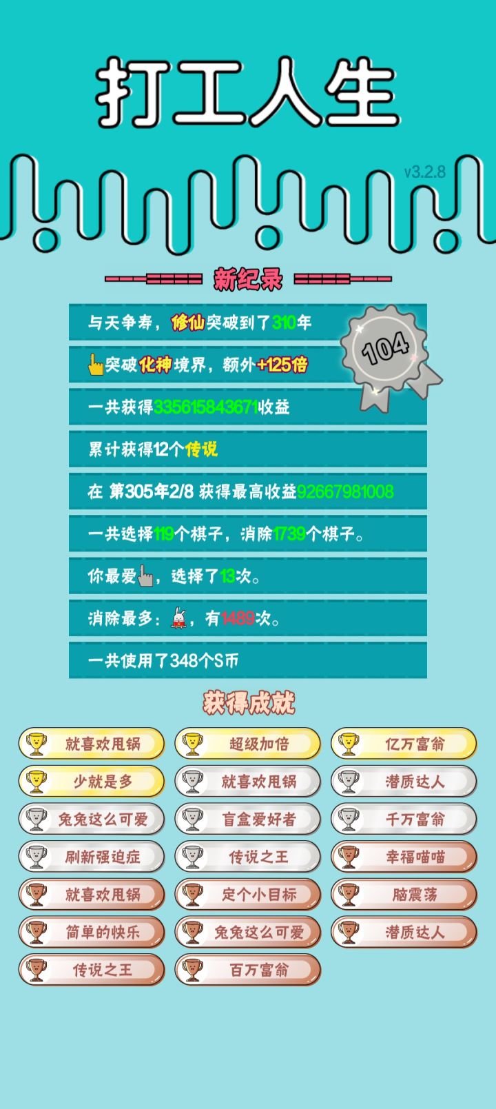 我打工坚持了559年。获得了第26名。共获得61847625559收益。累计获得16249个传说棋子。共选择428个棋子,消除13027个棋子。获得了42个成就!#单机游戏 #游戏推荐