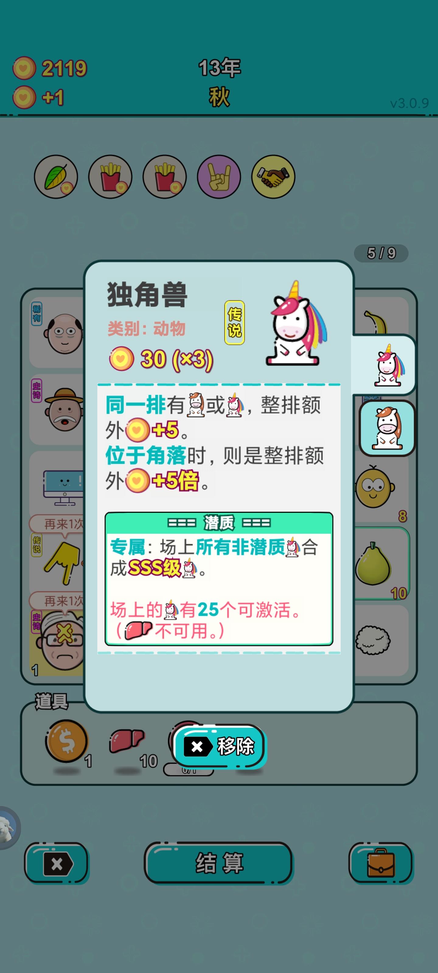 目前最强水果贵族没有之一。基本上拿到了就等于无敌了…为了做任务硬生生肝到400多年…一直很喜欢这种的游戏(以前有玩过类似的)给出几个建议。bug有一些…比如复制真的薛定谔…有时候能复制出来有时候复制不了…(有空位的情况下)希望能够多加强下其他流派天赋…目前水果贵族真的强无敌(虽然后期也没啥需要刷的就是了)6g希望全卡牌都能用,能够增加很多的可玩性…以及能够快速的完成任务。能
