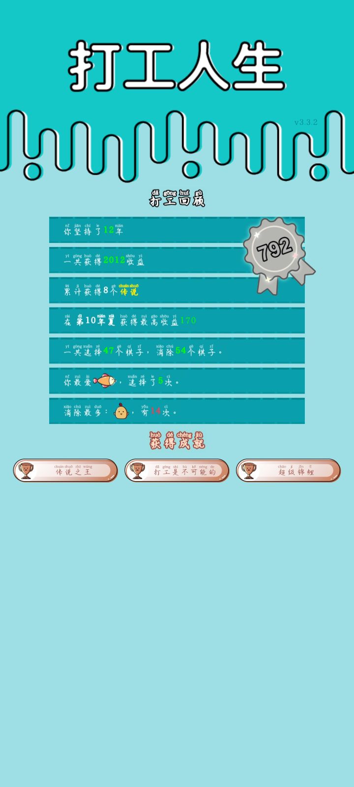 我打工坚持了12年。获得了第792名。共获得2012收益。累计获得8个传说棋子。共选择47个棋子,消除54个棋子。获得了3个成就!#单机游戏 #游戏推荐