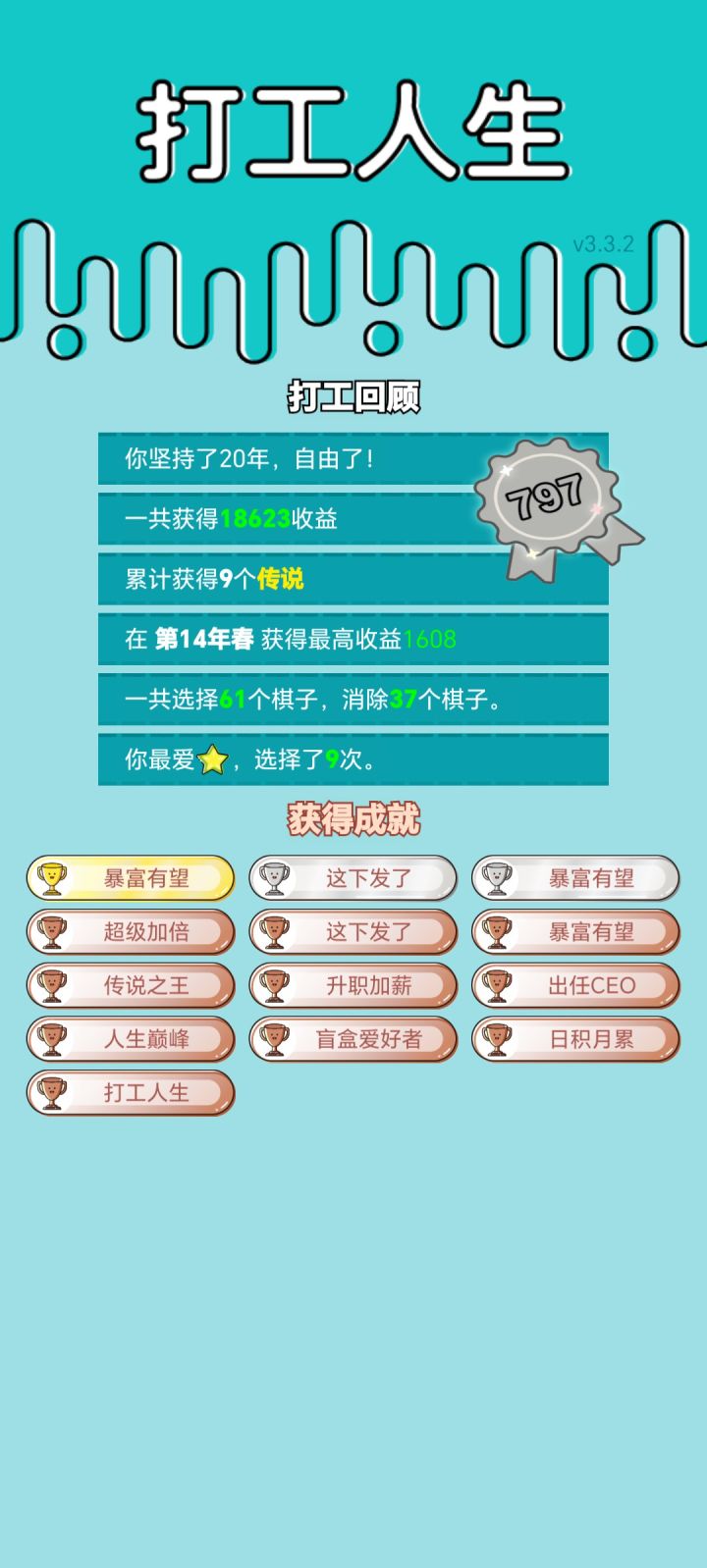 我打工坚持了20年。获得了第797名。共获得18623收益。累计获得9个传说棋子。共选择61个棋子,消除37个棋子。获得了13个成就!#单机游戏 #游戏推荐