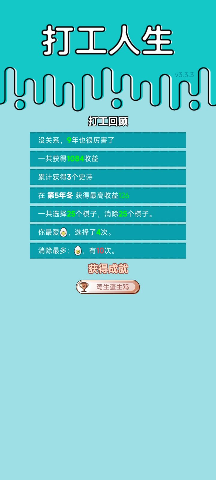 #单机游戏 #游戏推荐 我打工坚持了9年。共获得1084收益。共选择25个棋子,消除25个棋子。获得了1个成就!