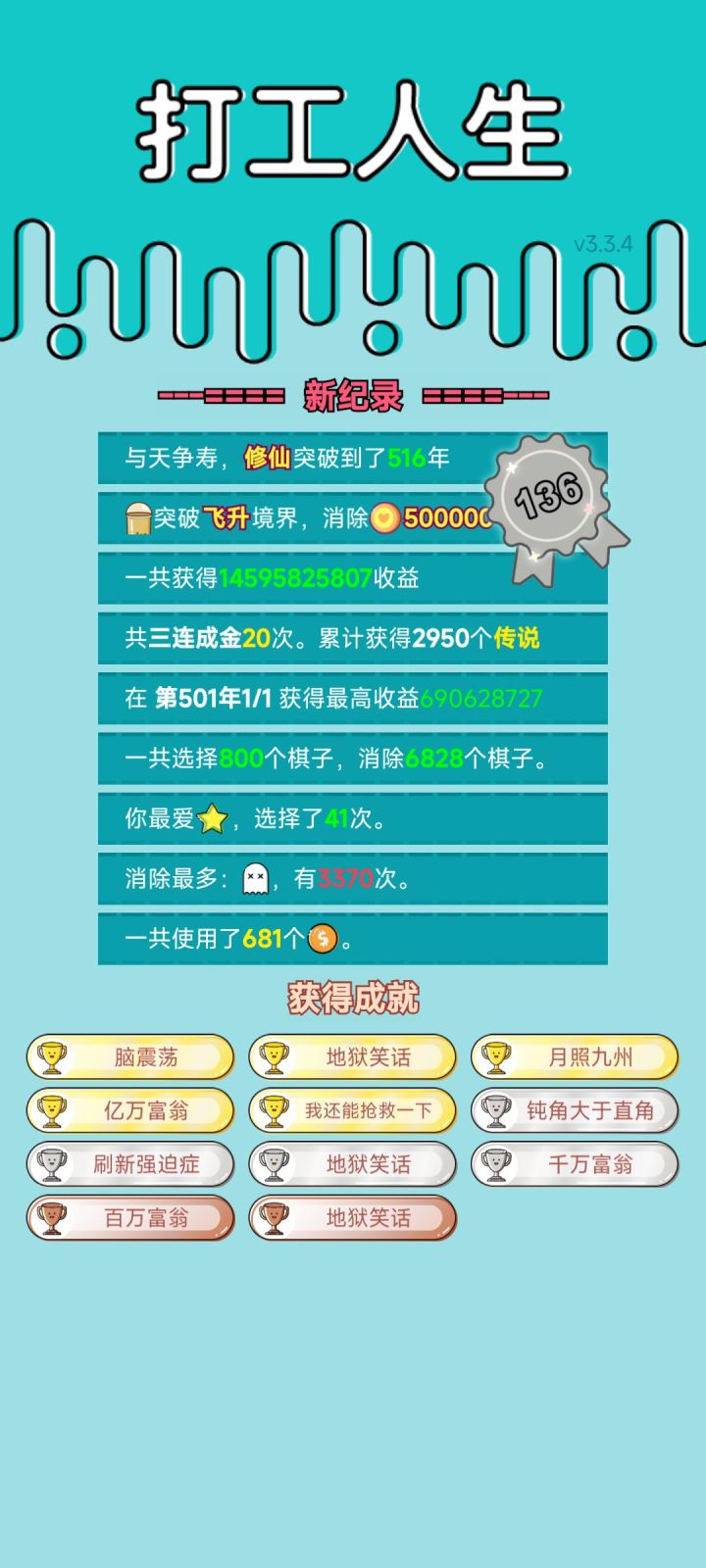 我打工坚持了60年。获得了第541名。共获得1383392收益。累计获得14个传说棋子。共选择249个棋子,消除387个棋子。获得了1个成就!#单机游戏 #游戏推荐