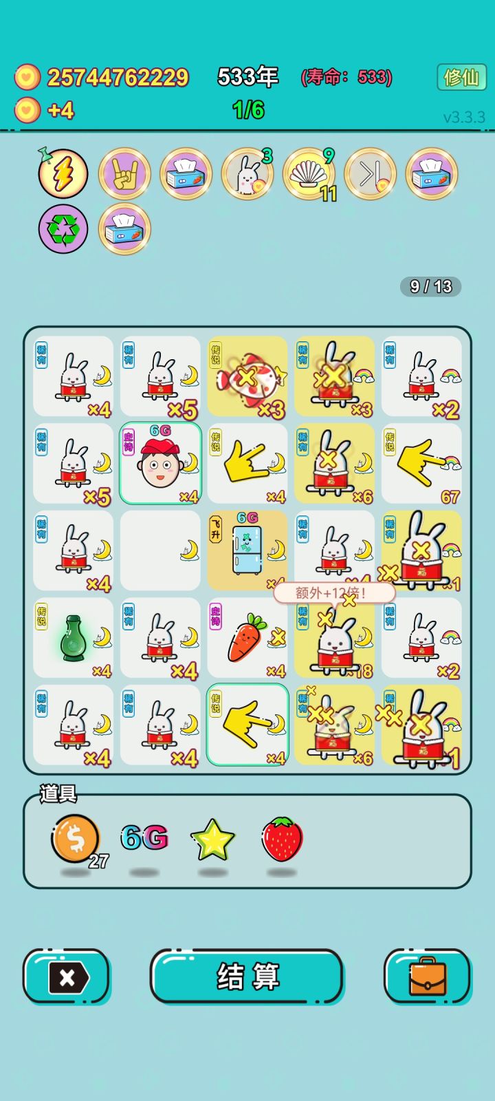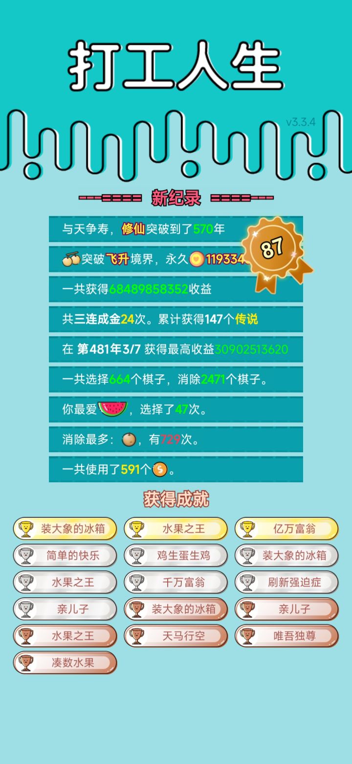 我打工坚持了570年。获得了第87名。共获得68489858352收益。累计获得147个传说棋子。共选择664个棋子,消除2471个棋子。我最爱一半西瓜,选择了47次。获得了16个成就!#单机游戏 #游戏推荐