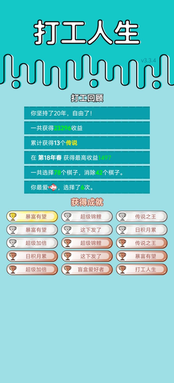 我打工坚持了60年。获得了第541名。共获得1383392收益。累计获得14个传说棋子。共选择249个棋子,消除387个棋子。获得了1个成就!#单机游戏 #游戏推荐