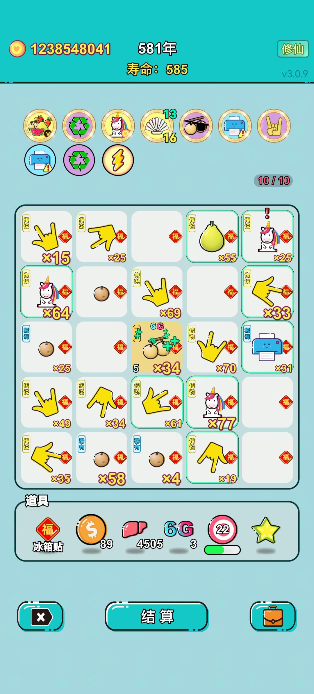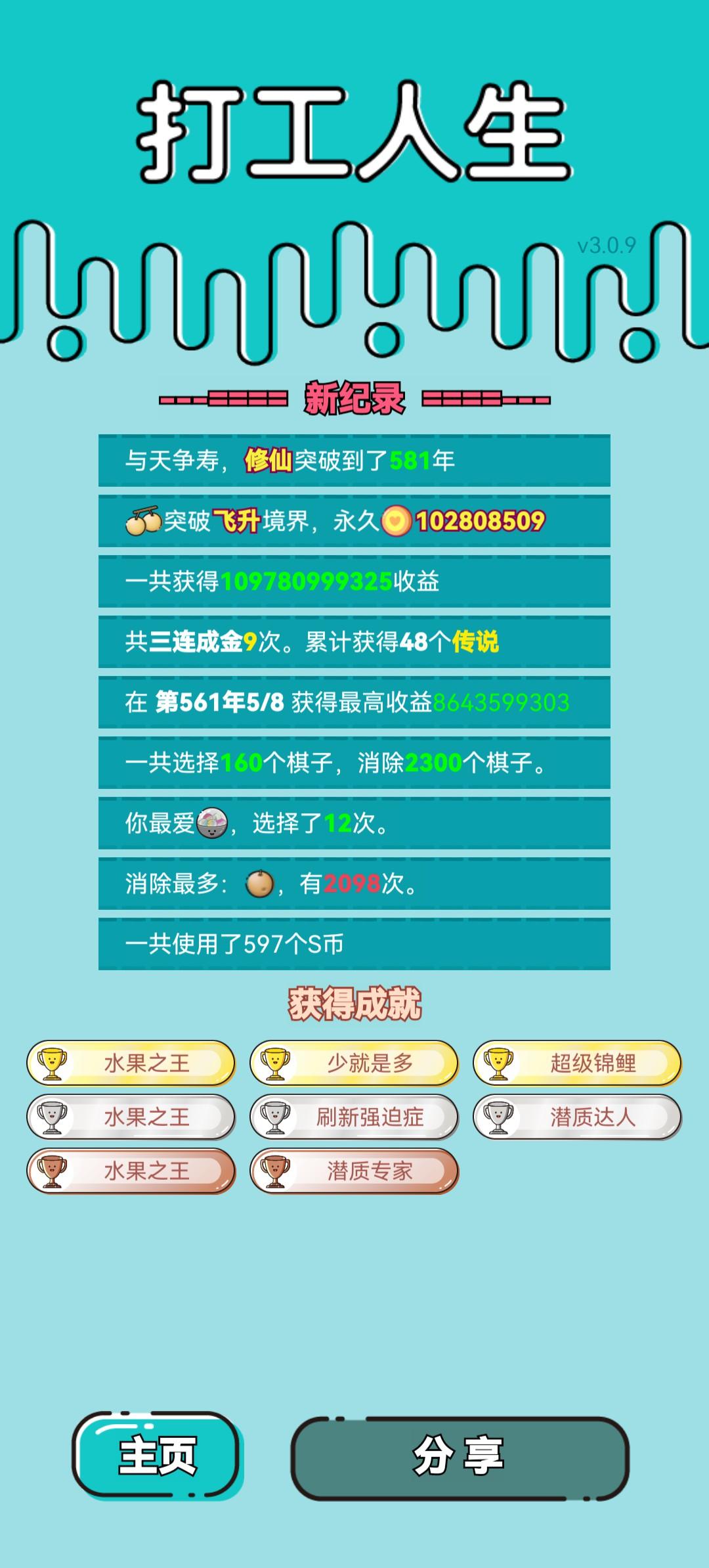 我打工坚持了620年。共获得9.999999999e+306收益。累计获得1089个传说棋子。共选择523个棋子,消除2131个棋子。我最爱一块西瓜,选择了40次。获得了3个成就!#单机游戏 #游戏推荐