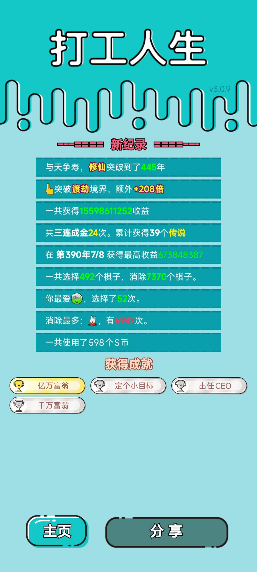 我打工坚持了445年。共获得15598611252收益。累计获得39个传说棋子。共选择492个棋子,消除7370个棋子。我最爱道具盲盒,选择了52次。获得了4个成就!#单机游戏 #游戏推荐 #单机游戏 #游戏推荐