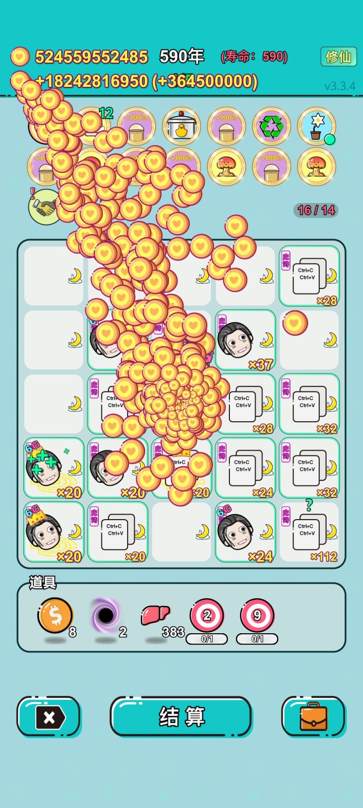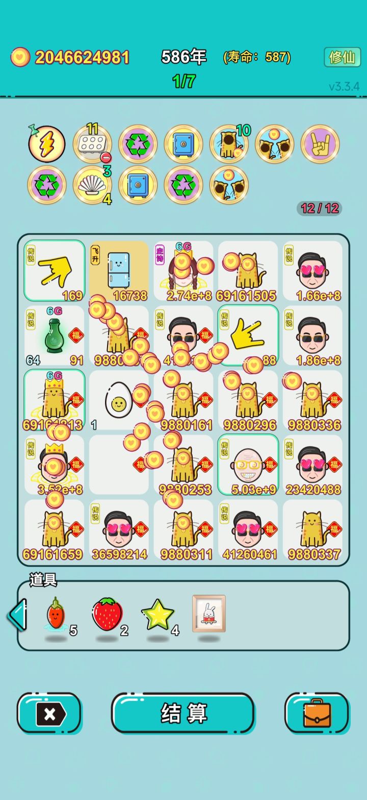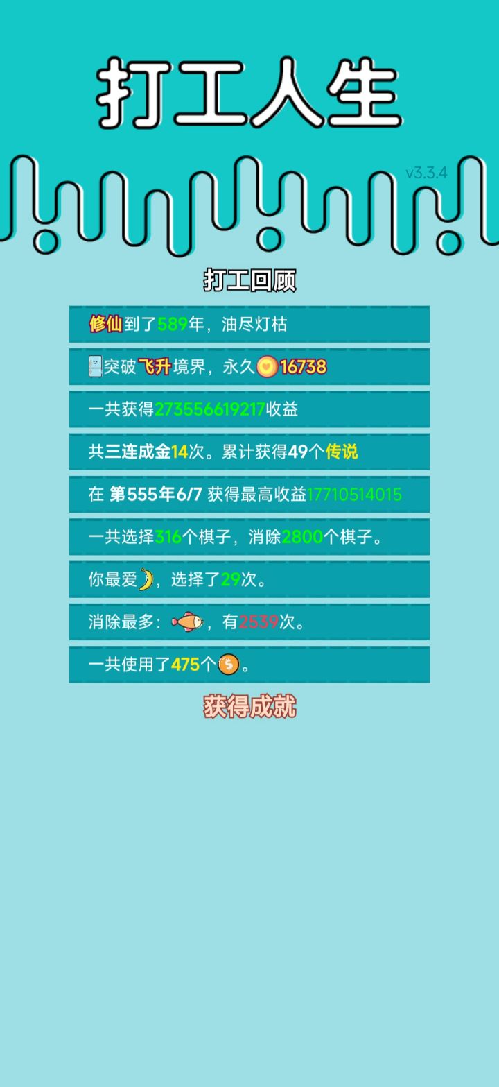 我打工坚持了589年。共获得273556619217收益。累计获得49个传说棋子。共选择316个棋子,消除2800个棋子。我最爱香蕉,选择了29次。#单机游戏 #游戏推荐
