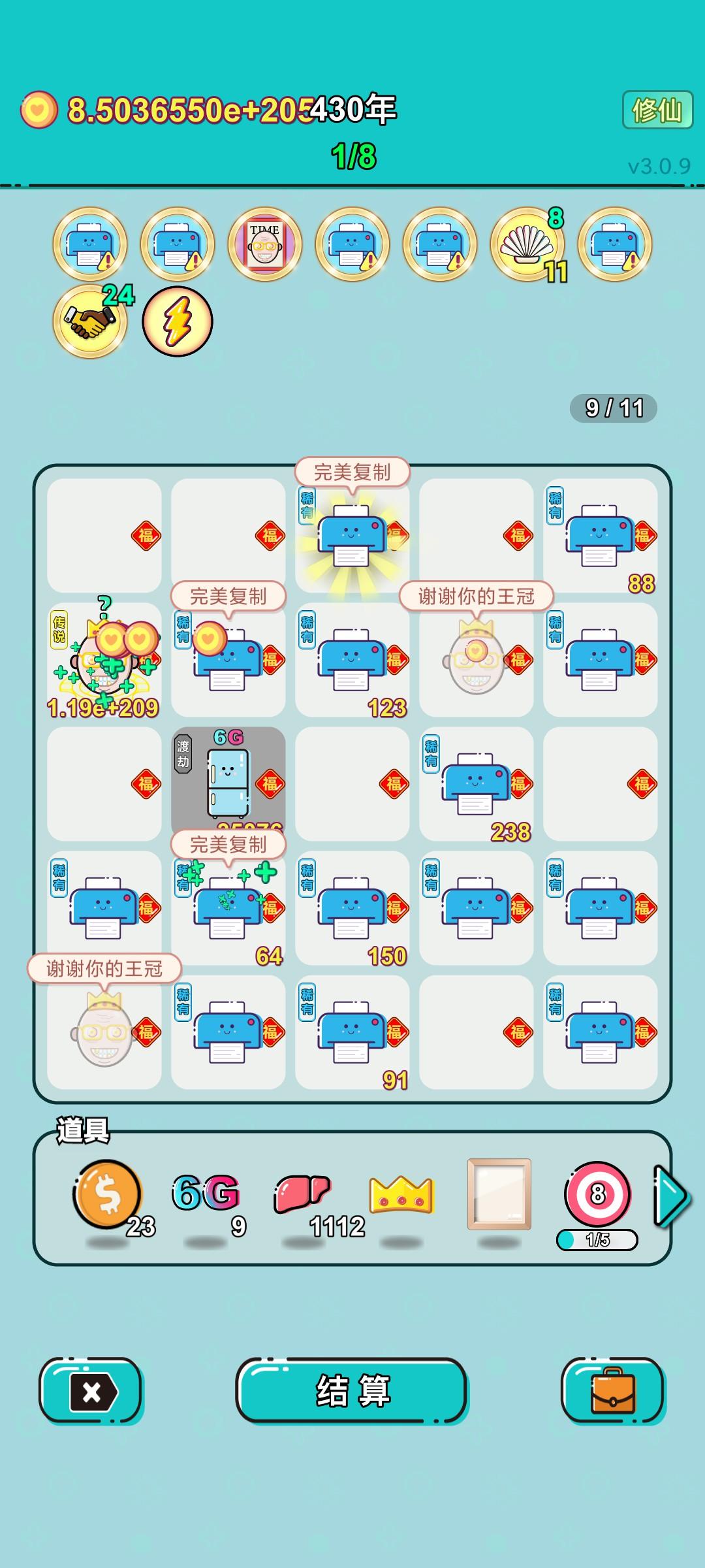 我打工坚持了620年。共获得9.999999999e+306收益。累计获得1089个传说棋子。共选择523个棋子,消除2131个棋子。我最爱一块西瓜,选择了40次。获得了3个成就!#单机游戏 #游戏推荐