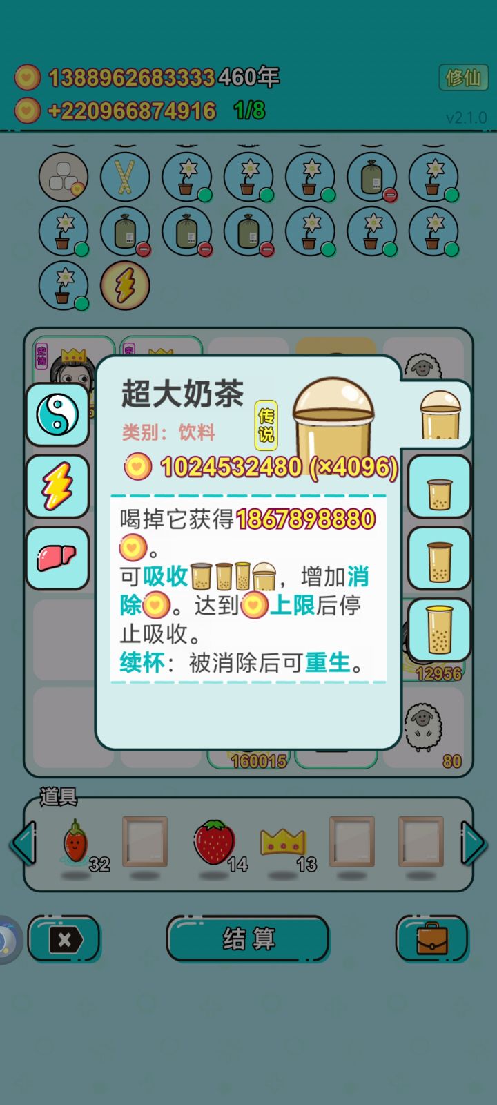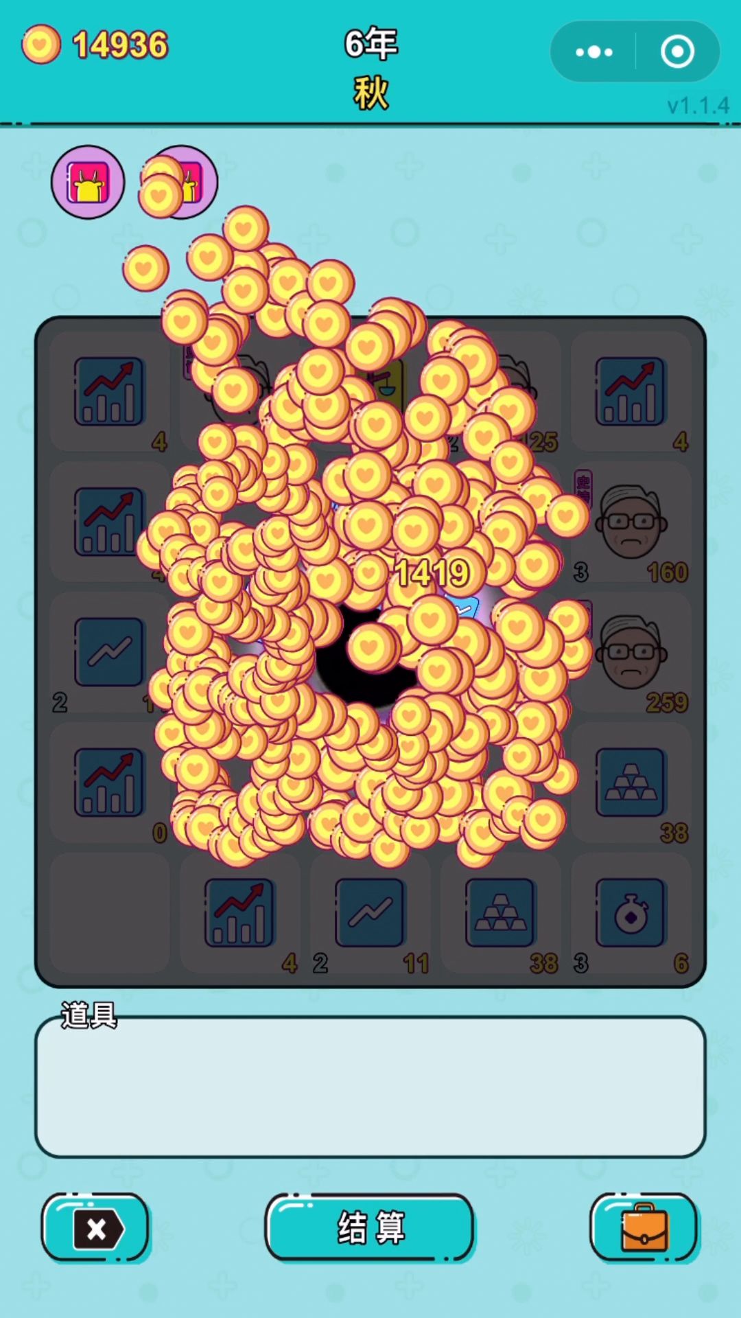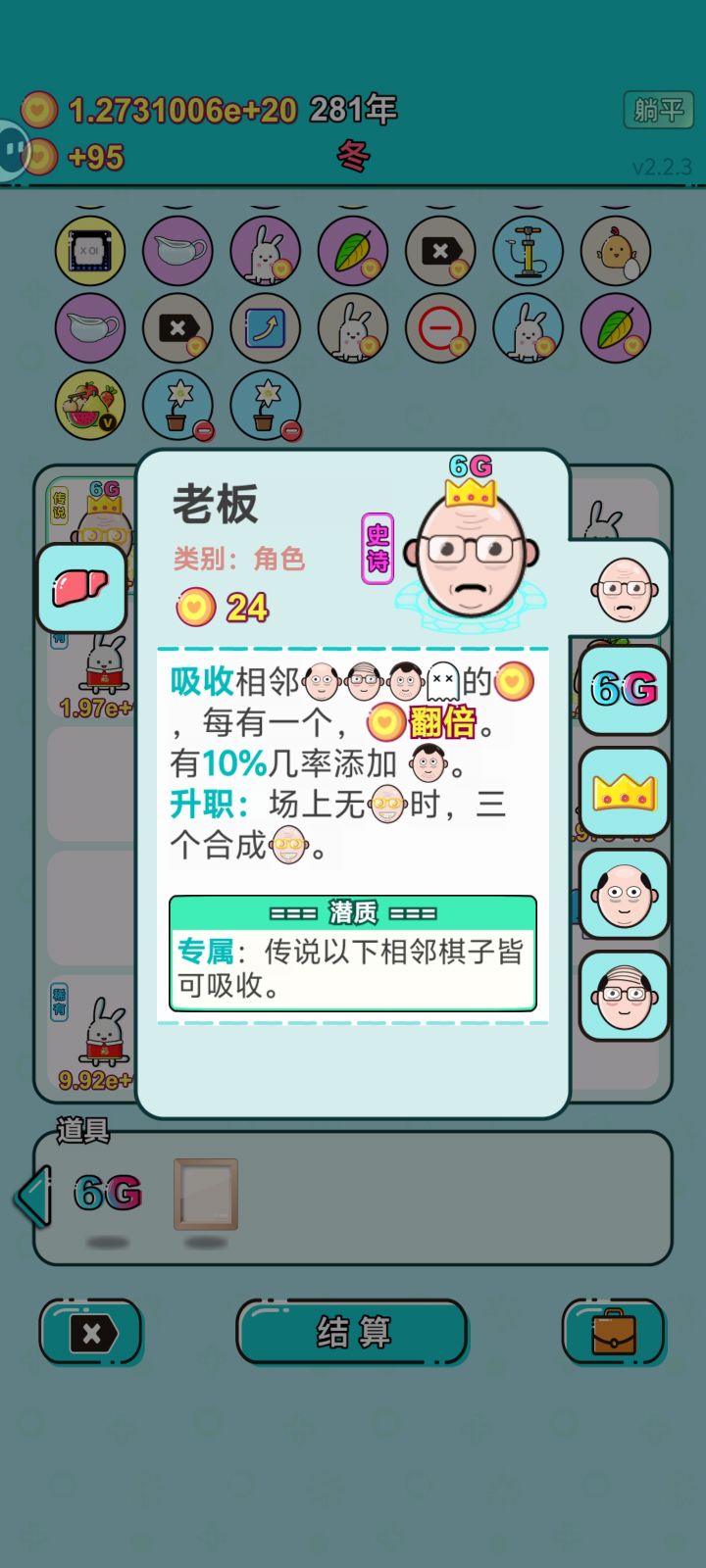 1、新增两个传说棋子【黑洞】和【投机】; 2、新增一个史诗天赋【牛市】; 3、现在冰箱可添加水果增益类,双倍效果; 4、增加增益道具类的使用遮罩效果; 5、优化左上角金币的显示效果; 6、优化信息框的过渡动画。 投机:可和投资收益类搭档,通过不断减少次数,来刷新收益。 牛市天赋:通过进一步提高投机的作用范围,开获得数倍的成长收益。 #打工人生