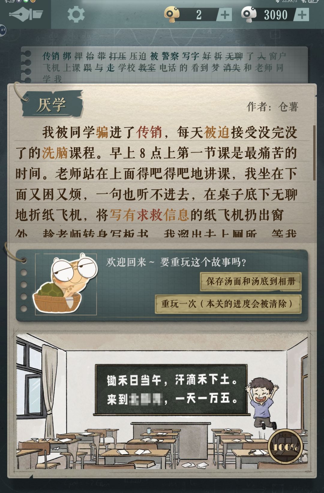 5、猜出被遮住的关键词以后,你会得到一百个白蘑菇;