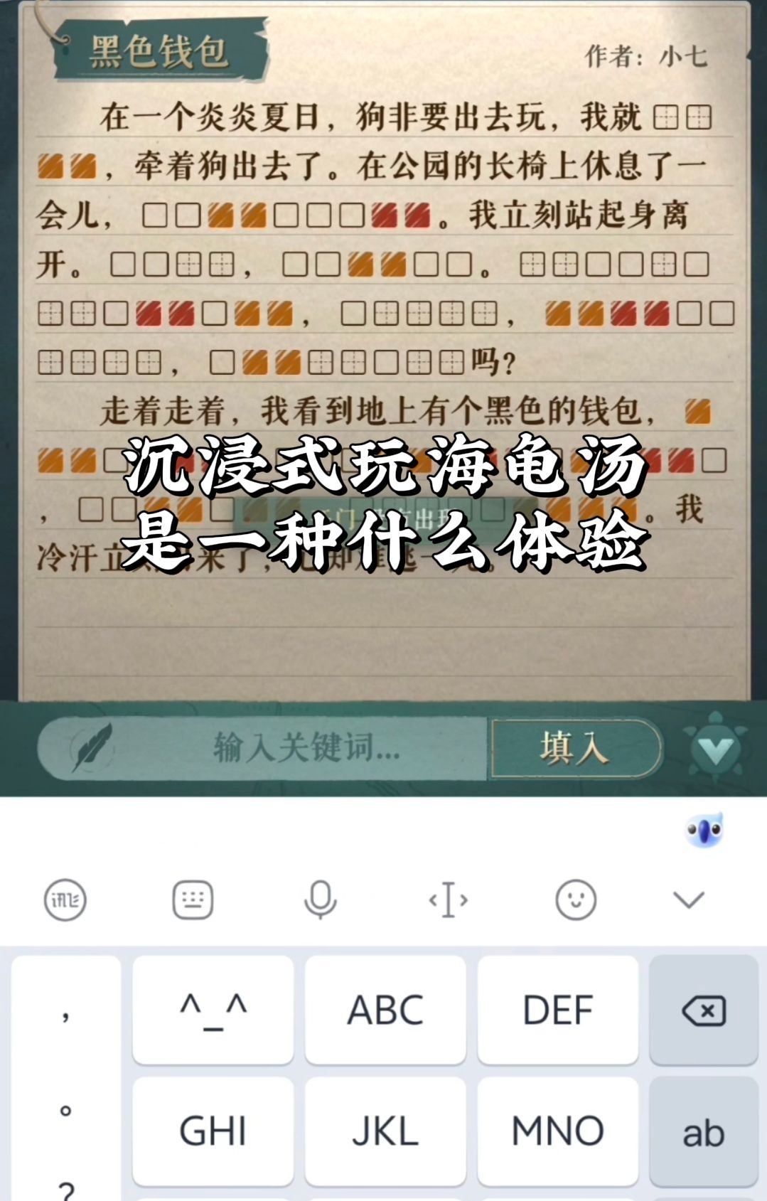 看起来很普通的一个海龟汤,加上背景音乐,文字填空好多没猜出来,猜到一半真的自己吓自己了,忍不住开了两次提醒[表情_捂脸哭] 十分钟才过,是什么水平#海龟汤