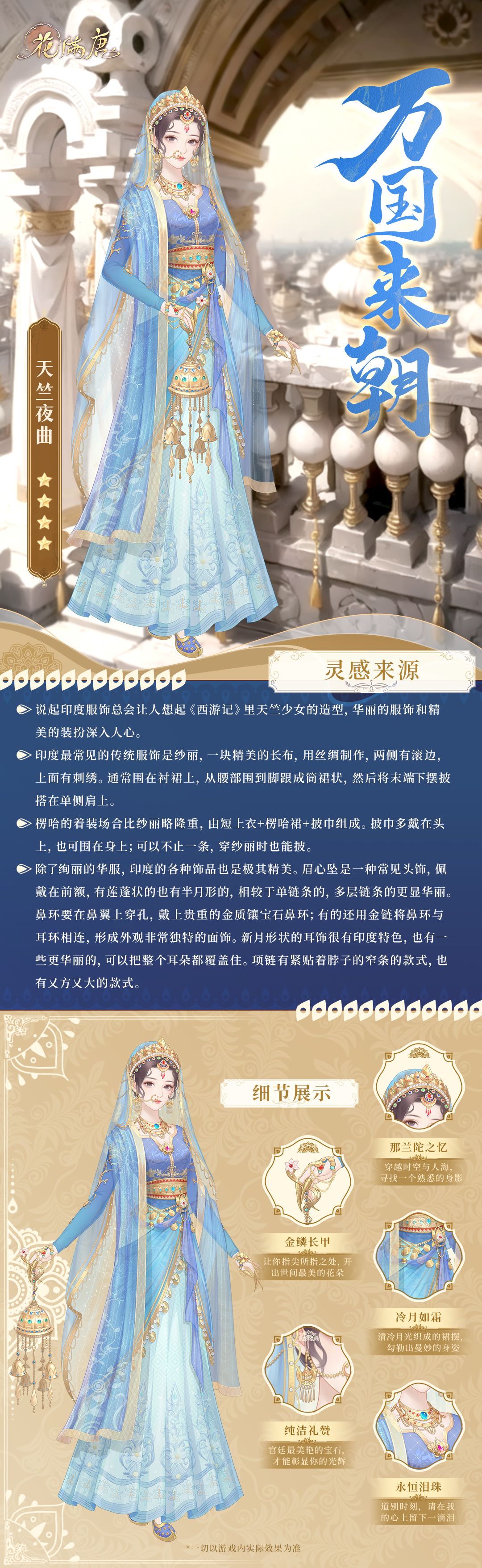 除魔花使们好呀~ 婉儿的衣橱里有各式各样的服装,除了充满传统古韵的华服之外,也有很多表现异域文化特色的服饰呢! 碧穹似梦,心如宝月映琉璃,今天就为大家介绍这套古印度风情的「天竺夜曲」吧(*^o^)人(^o^*) 「带着缀有露珠的花瓣,少女回眸,彩光摇动下轻舞一曲,金珠薄纱引人驻足长凝。」
