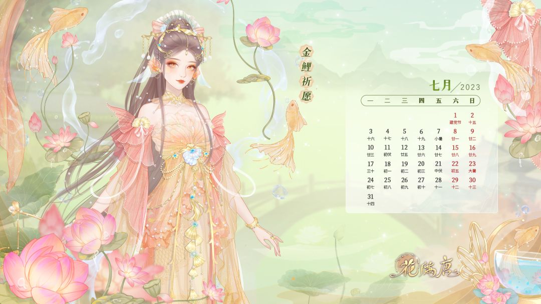 除魔花使们好~ 七月浮光碧波,倚亭楼静赏荷塘,水面的凉风徐徐漫来~ 金光在池中一闪,磷尾乍起水波溅上轻纱的衣裙,锦鲤游动之时,转瞬携祈愿而去。 为大家带来了《花满唐》七月的精美壁纸!手机和电脑的壁纸都准备了哦! 金鲤伴好运,换上日历壁纸,美好的七月正当时呦(σ゚∀゚)σ 7月13日《花满唐》公测开启,花开缘起,今夏七月一起穿书享受这段国风之旅~
