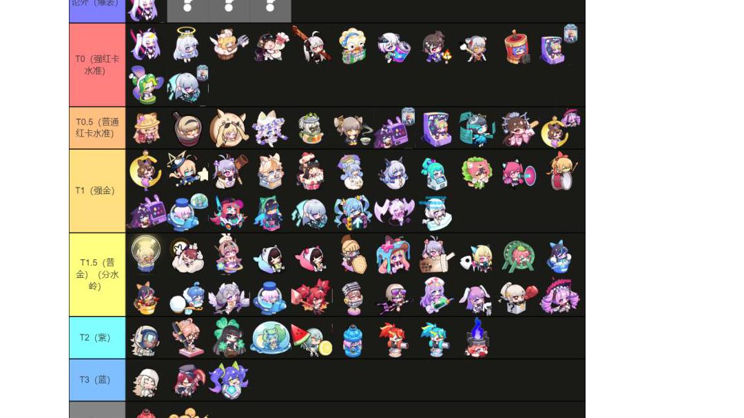 本期主要变动: 海军成为卷卷上位替代,塔菲加强超越五星皮卡 在果冻的加成下,水枪梯度上升,强力消防栓梯度上升 ex为超标档位,每期评选两个。辅助类及产能角色不参与评选 左上角角标为所需的辅助,右上角为星级,不标的默认0-3星 排名为综合排名,纯主观判断 #盲盒派对 #盲盒派对夏日创作激励
