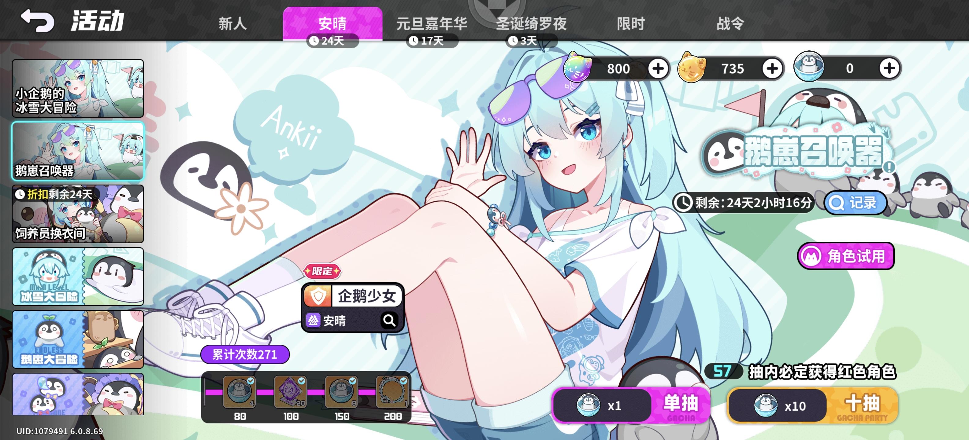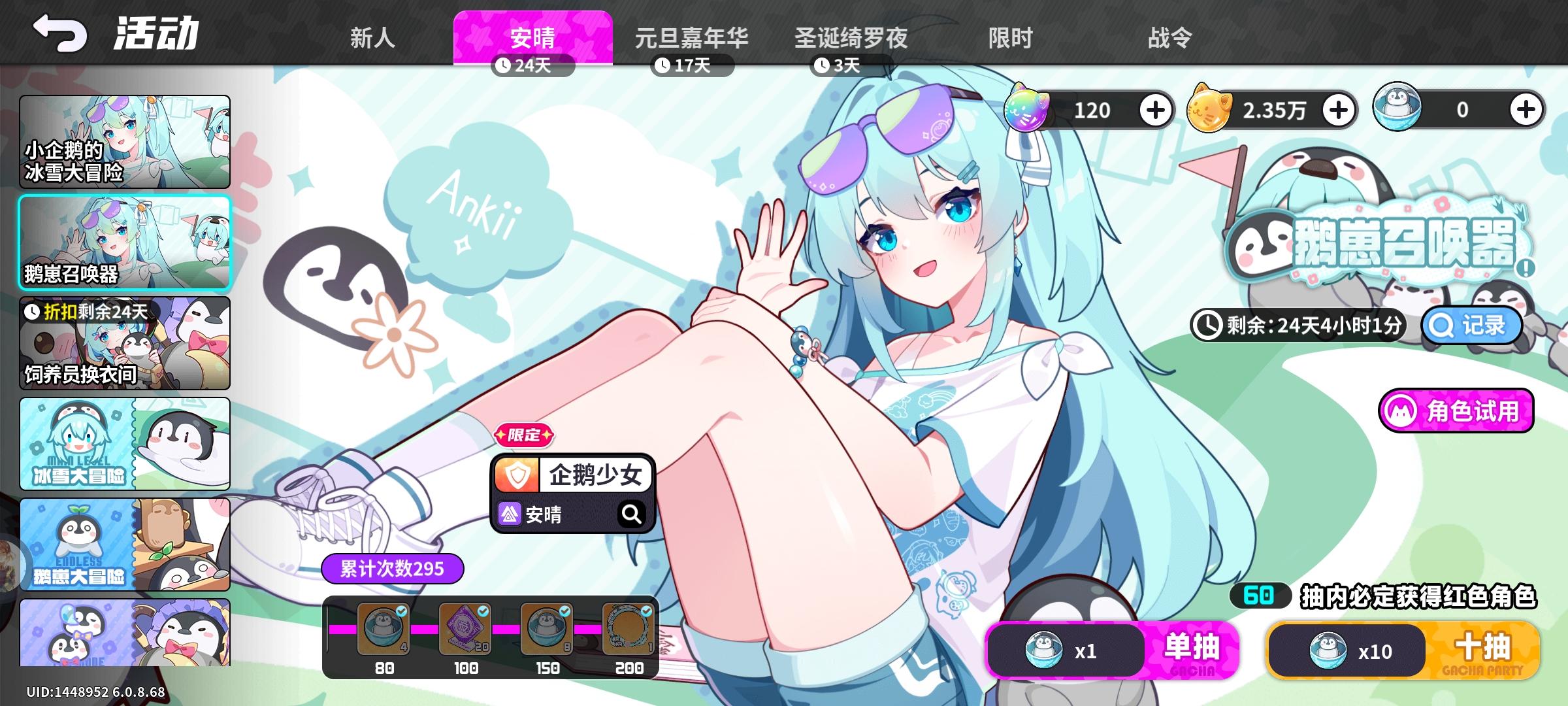 一位集学霸智慧与抽象灵魂于一身,披着可爱企鹅外套的“成精”企鹅少女——安晴Ankii即将加入盲盒派对!参与联动主题活动,免费获取限定SP「企鹅少女·安晴」 !▌联动角色:企鹅少女 - 安晴 「恭喜你成功关注了小企鹅安晴,喜欢的话可以多来找我哦!」▌专属服饰:暖冬夜眠 - 安晴 「这是我的企鹅装,怎么样,还不错吧?」 【有奖活动】检测到异世界电波正在靠近!需要班长们用炽热的应援为安晴铺