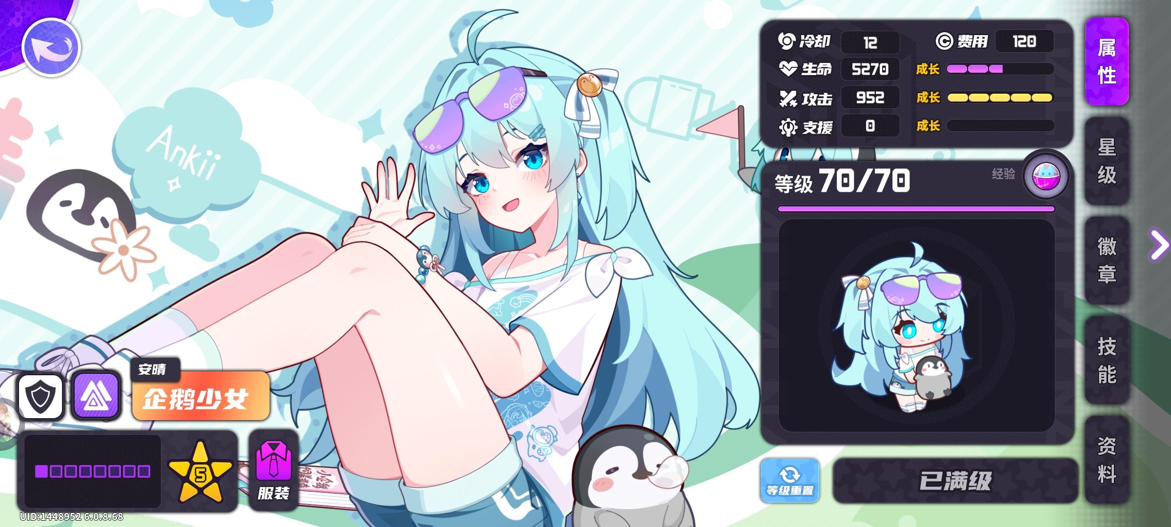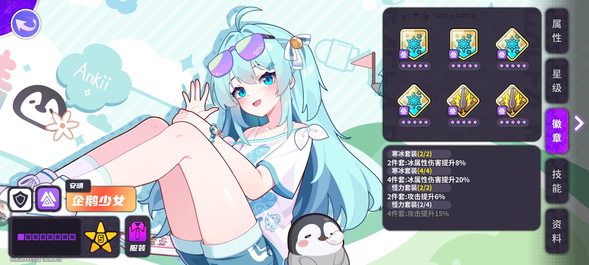 基础属性2倍面板,4攻击二盾形章,攻速为10s子弹命中后生成一只小企鹅,企鹅存在20秒,攻速为2s,伤害类型为冰,时限到期时,将即刻消失星级描述以游戏为准,基本无异意初始100%攻血倍率,135星攻击继承倍率提升至150%/200%/300%,24星血量继承倍率提升至150%/200%详情数值本体与企鹅分开计算五星时:285*2=570*1.47+100=937.9=938*1.