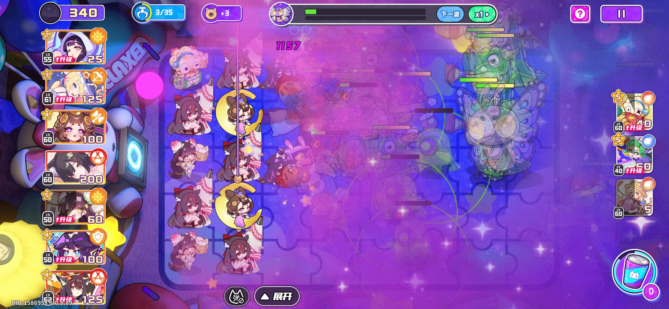 阵容搭配1.主力输出:约定天使(对群)+暗夜公主(易伤)。2.伤害补充:雪糕刺客(破冰)+炽热射线(点燃)。3.群体控制:雪糕刺客(失衡)+雪人女王(冰冻)4.前排抗伤:小洋伞(护盾)。5.生存保障:琉璃治疗师(小奶)+小熊工程队(小盾)。 主力输出的伤害足够。小洋伞的血量能达到8.8万,带盾14万。生存保障(金卡,低星)的表现不尽人意。想冲到400比较困难,我还缺一个红卡辅助
