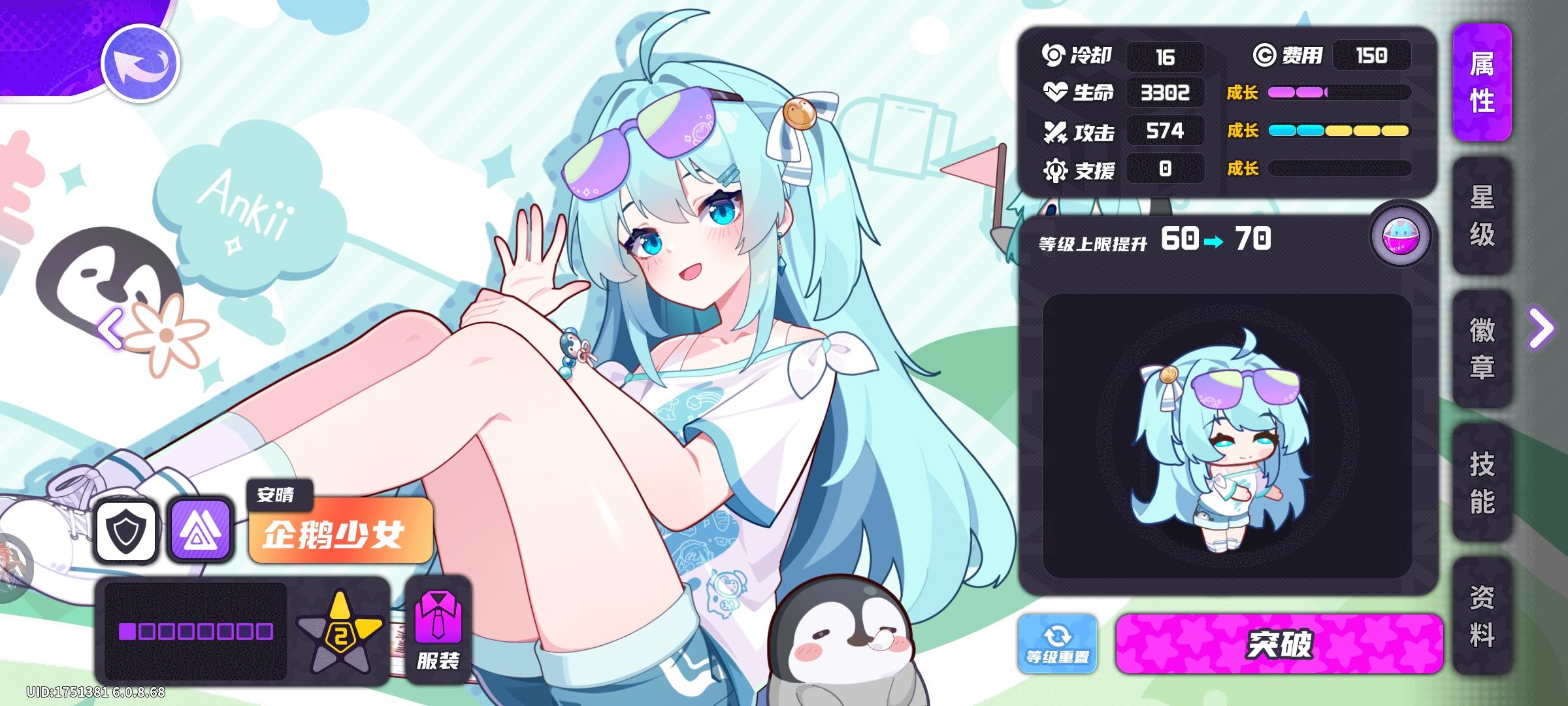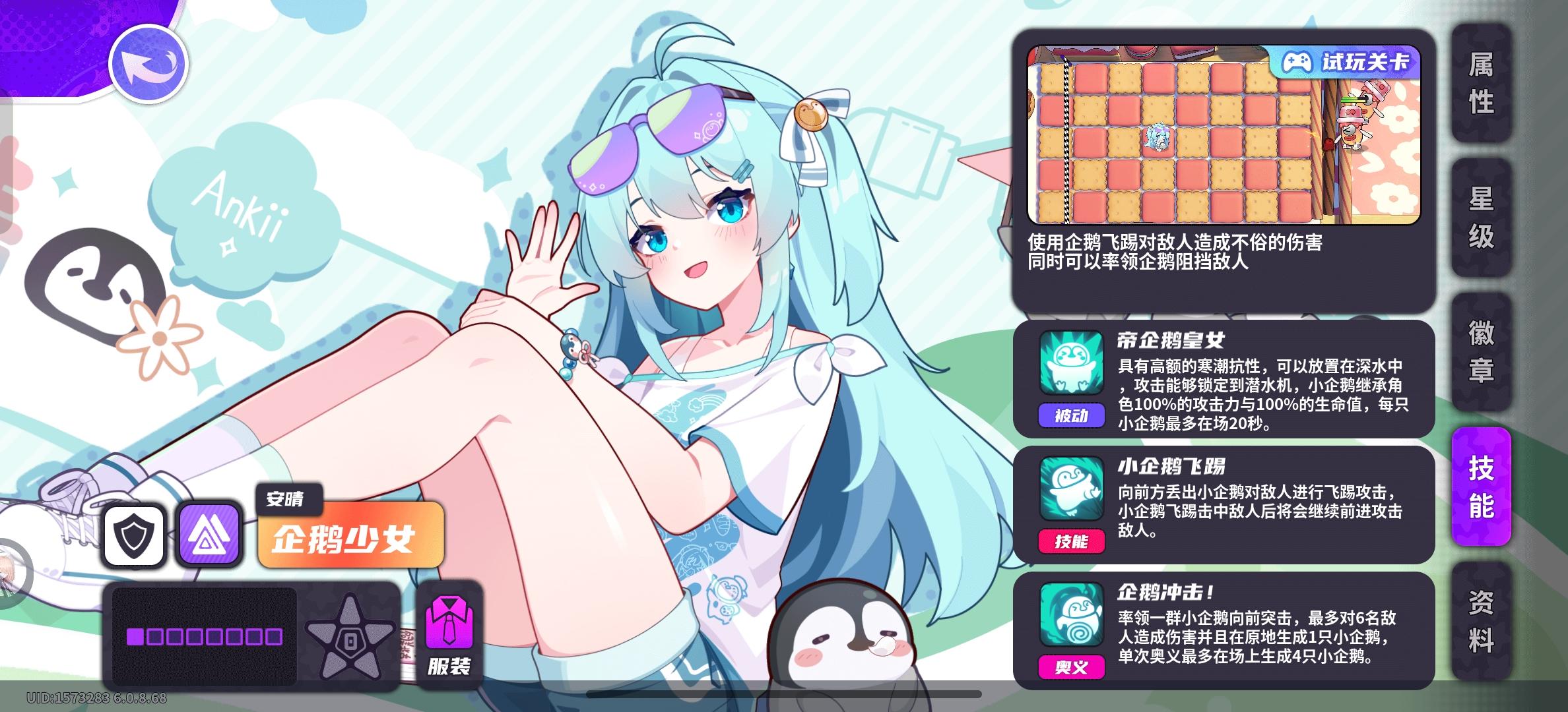 基础属性2倍面板,4攻击二盾形章,攻速为10s子弹命中后生成一只小企鹅,企鹅存在20秒,攻速为2s,伤害类型为冰,时限到期时,将即刻消失星级描述以游戏为准,基本无异意初始100%攻血倍率,135星攻击继承倍率提升至150%/200%/300%,24星血量继承倍率提升至150%/200%详情数值本体与企鹅分开计算五星时:285*2=570*1.47+100=937.9=938*1.