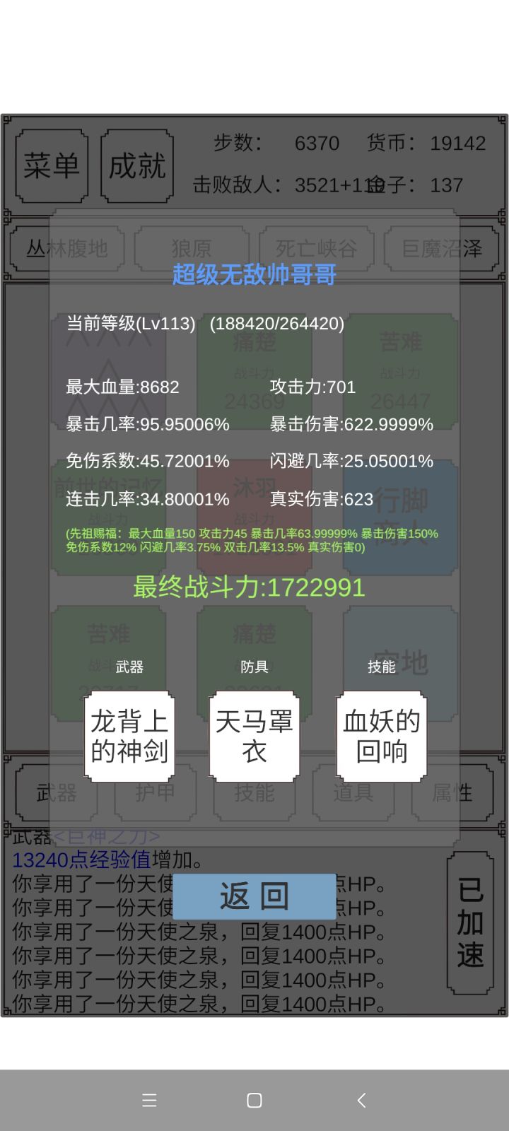 身为一位苟道中人,刷到20级后在新手村刷到一百万战力才出山,中途还刷了好久,万万没想到,这邪恶的化身居然才四十五万的战力,本来想刷祭坛把所有几率都刷满再出山的,幸好没这样