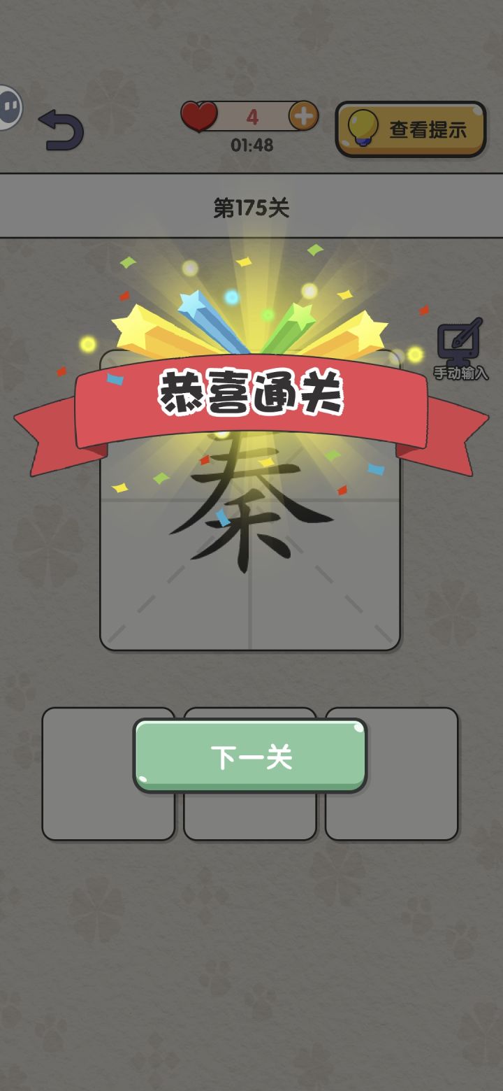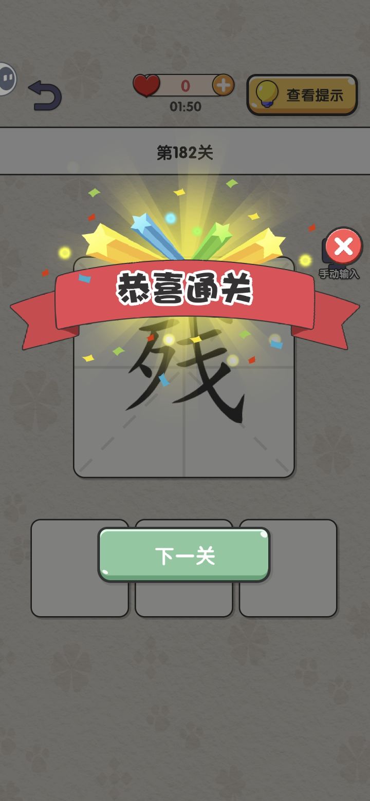 都是很常见的字,本来以为很简单但实际有些不容易想到,也挺有意思的,还是可以一玩的。这几天有空想起来就过一下这个游戏,不知道一共多少关,目前179关,但记得从164关就开始重复前面的字了。