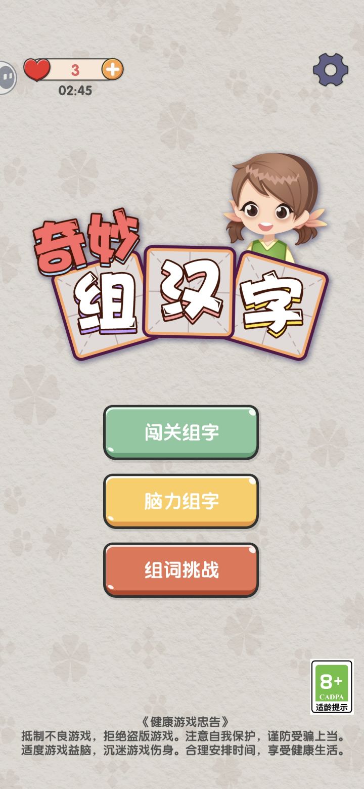 游戏分三个模式,闯关、同偏旁组多个字、用偏旁组词,除了闯关以外其他模式关卡都很少。注意到这里有一个设计上的小问题,关于闯关模式里“下一关”界面,在体力有剩余时,“下一关”界面里没有返回主菜单的按钮,如果想换到其他模式就要退出重进或者在下一关返回(在下一关返回会浪费一个体力);但体力没有剩余时,“下一关”界面就会有个“❌”来返回。如图2和图3。