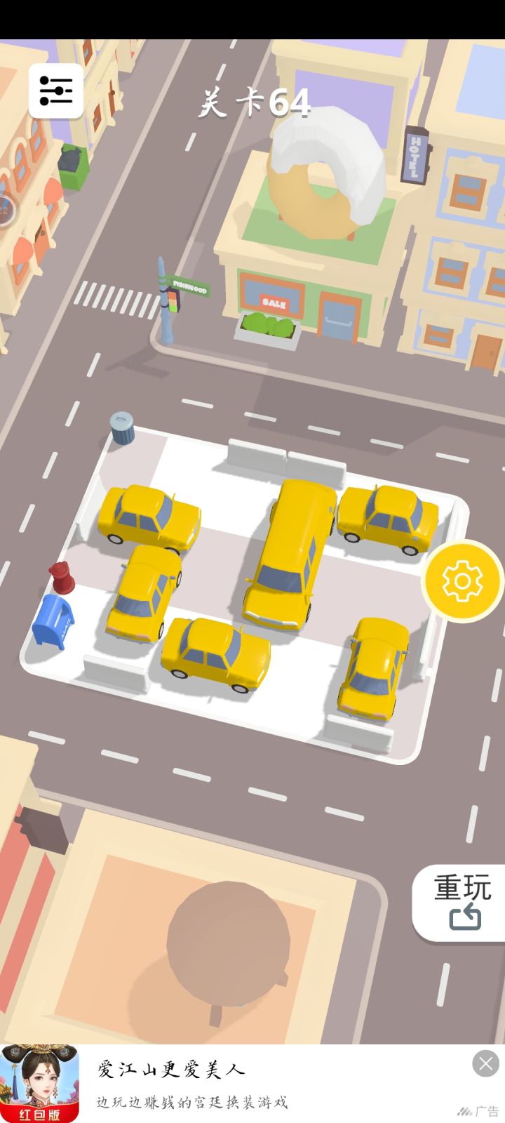 关卡有些简单的,希望做多点车能多玩会儿,和网上有些视频中的那种:今天我结婚,大家让让的停车场游戏是一样的,最重要的是没有广告,没有广告,没有广告,多良心的游戏啊,所以凭啥评分这么低啊,伤心