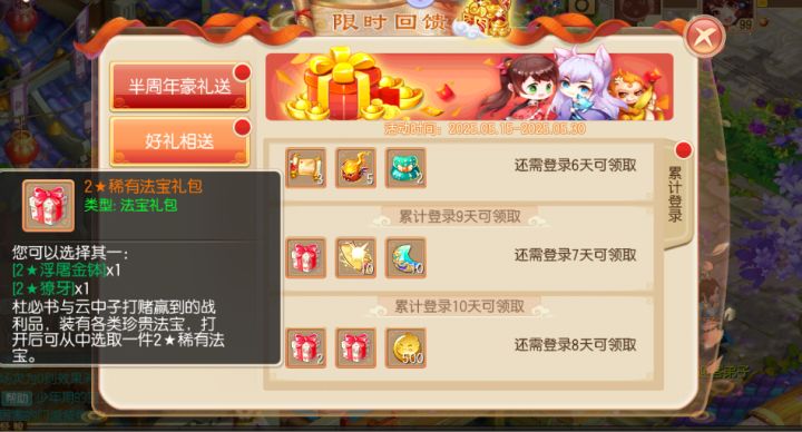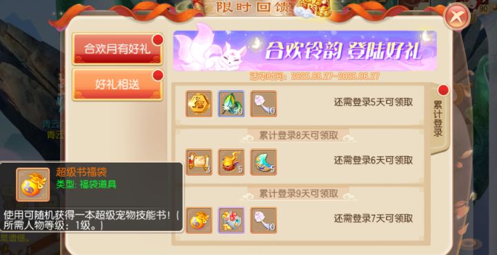 适逢岁半,佳礼相伴~梦诛八岁半到来,我们为大家准备了半周年豪礼,就等大家登录领取!与此同时,本月还将迎来合欢派重置,作为合欢重置狂欢月,5月13日全新互通服【月下合欢】将正式上线,另外还有各项福利活动也会陆续登场,少侠们今天就先跟兜妹浅浅了解一下吧!半周年豪礼送梦诛八岁半,半周年豪礼送不容错过!从5月15日起,到5月30日为止,每日登录就能领取登录奖励!奖励持续10天,各种丰富珍稀道具应有尽