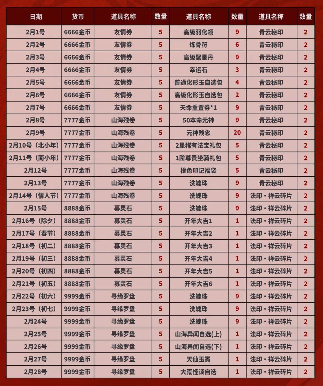 梦诛新春版本正式上线啦!超多福利活动期待少侠们参与,更有同步开启的编号777全新豹子服【祥瑞岁启】,等待少侠踏入!今天兜妹将一口气带大家看完新版本中全部福利活动,让我们开始吧!春节邮件福利春节将至,专属于春节的好礼已经为大家准备好了哦~从2月1日-2月28日,每日登录游戏,即可通过邮件领取福利!【福马送豪礼】活动福马送豪礼啦!2月1日到22日期间,在活动面板每天可领取1000金币;2月23