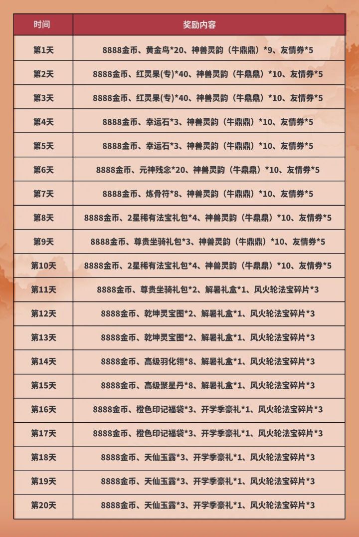 金秋九月,喜迎开学!为了庆贺新学期开学,我们开启了开学季狂欢月,长达二十天的福利,只要登录就能领取哦!兜妹掐指一算,所有礼包总价值高达千元,少侠们可千万不要错过哟~从9月6日起至9月25日,等级≥30的少侠,只要每晚20点登录游戏,即可从邮箱中领取开学登录礼!除了每日必得的8888金币之外,少侠们还能从礼包中获得神兽灵韵(牛鼎鼎)、友情券、风火轮法宝碎片、2星稀有法宝礼包、尊贵坐骑礼包、黄金鸟、