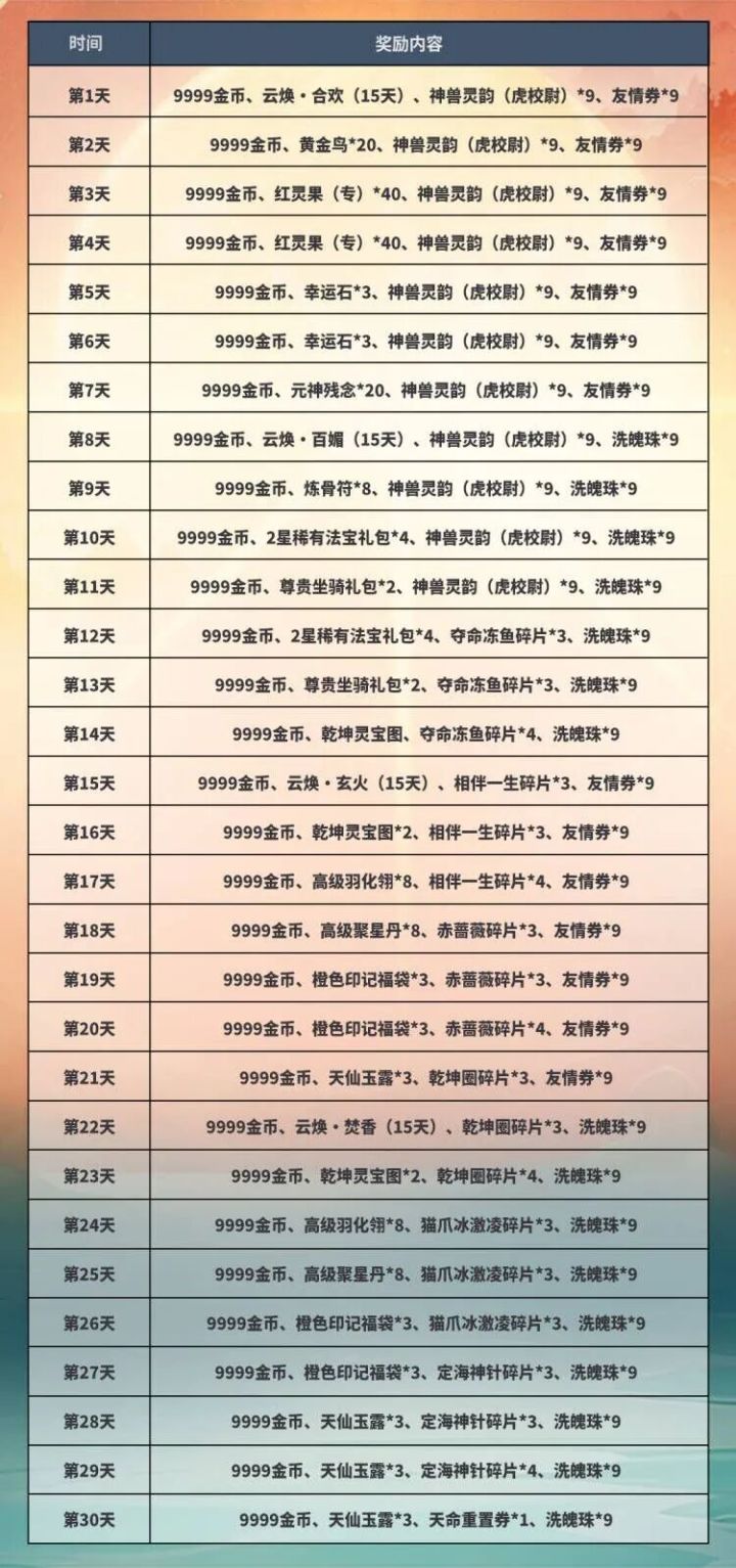 时光匆匆如流水,不知不觉中,《梦幻诛仙》手游已经陪伴大家度过了快9年时光!梦诛即将迎来9岁生日,我们将为大家开启盛大狂欢月!即日起,每日登录游戏,少侠们将连续30天收到我们发送的福利邮件!邮件中除了每日必得的9999金币之外,更有神兽灵韵(虎校尉)、尊贵坐骑礼包、橙色印记福袋、天仙玉露、夺命冻鱼碎片、相伴一生碎片、赤蔷薇碎片、乾坤圈碎片等道具,所有礼包价值超过千元,绝对豪礼,少侠们不容错过哦!
