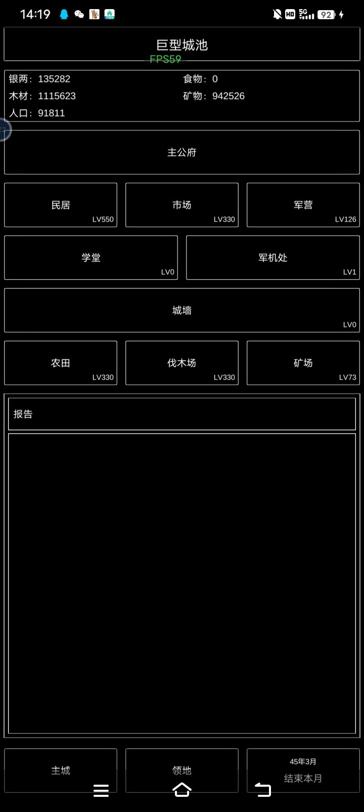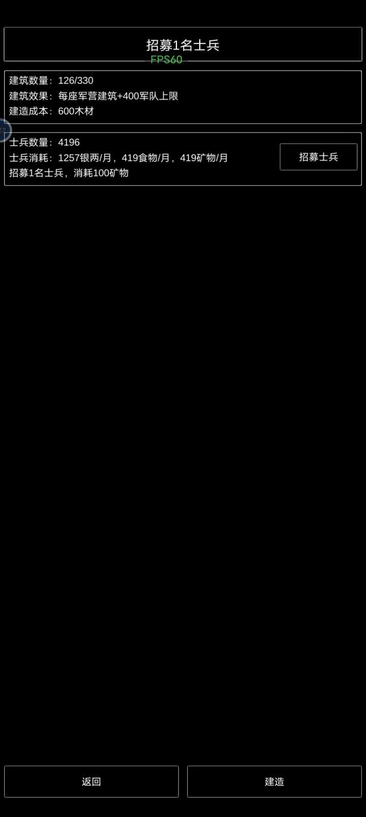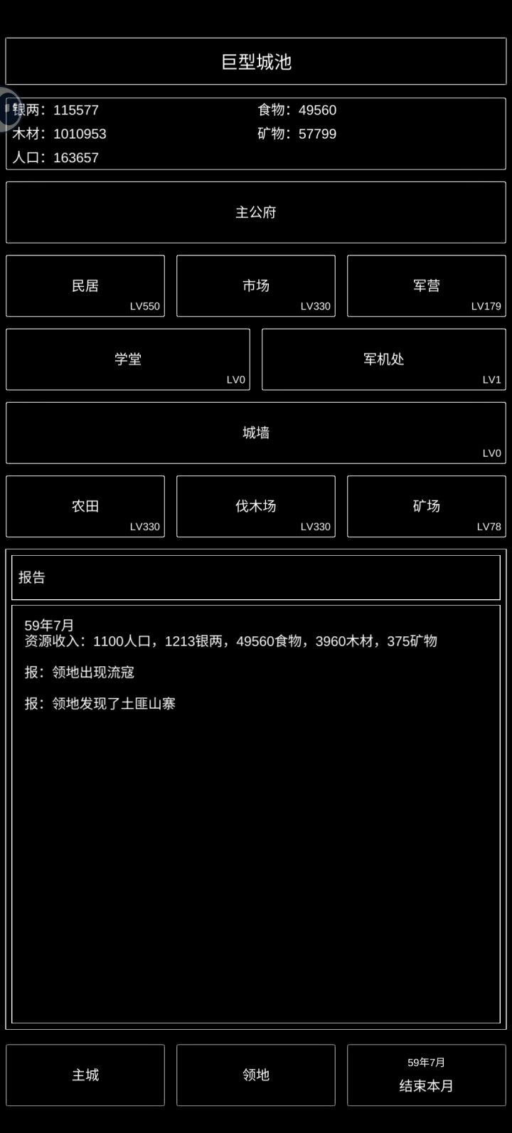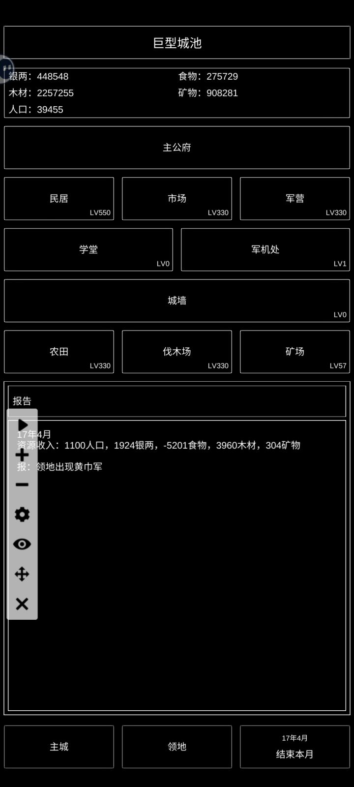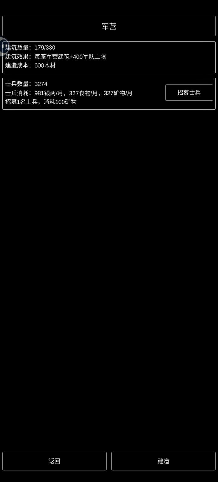 图一:卡了个BUG,除了食物不可购买,木头和铁可以无限购买,银子变负数。怎么卡的我也忘了…图二:村子等级最高只有巨型城池,学堂、军机处、城墙没开放。居民、市场、农田、伐木已经是最高等级。矿场—领地发现新矿一定要占领。图三:军营—招募只能一个一个的招募士兵,手都点酸了。