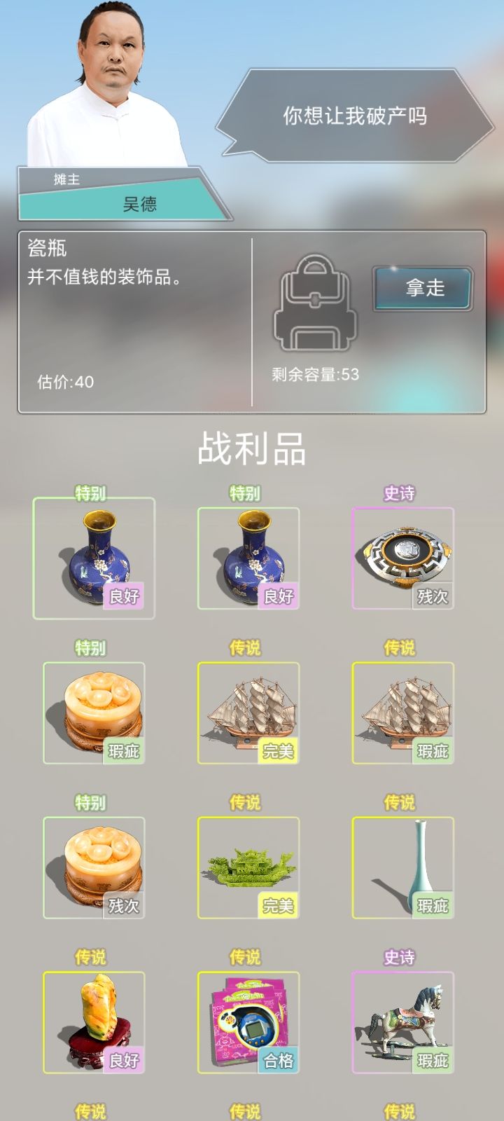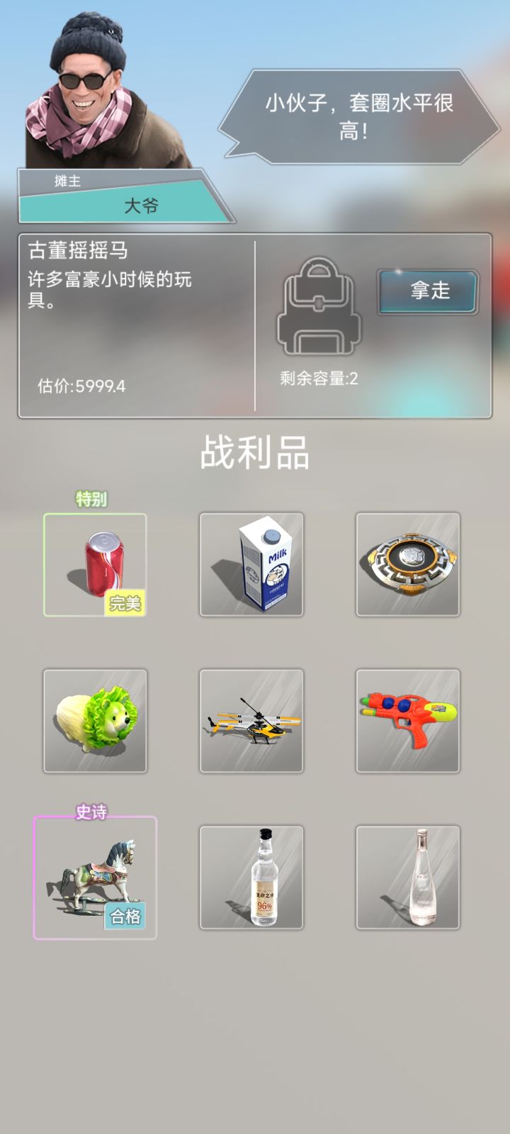 然后是玩法:目前游戏的主要玩法是两种,一种是花钞票进行套圈,套圈能力可以通过钞票进行升级,钞票还可以用来泡妹子,买房。二是可以通过套圈得到的物品可以卖出去,价格不固定,可以在一个范围内进行讨价还价。优点是,套圈的难度做的不错,有一定的难度。但也掩盖不了游戏玩法单调,缺少创新玩法,只有套圈题材的模子,缺少套圈题材真正独特的点等问题,我的建议是可以增加偶遇路边摊或者帮被坑的人套老板等随机事件。。。