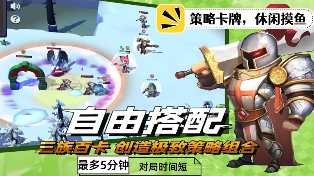 即时战斗策略卡牌,三大种族百卡搭配,对局时间短,玩法多样!