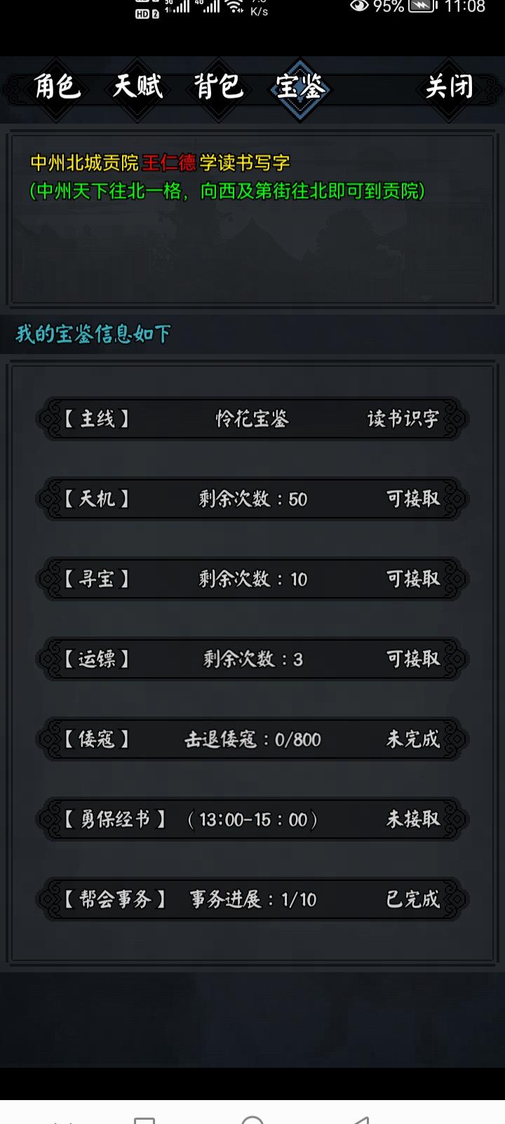 开局按流程后会有人叫杀你,你点逃跑跑不了,多点几次就可以跑掉了,几率较低,成功逃出后背包会获得怜花宝鉴,可以读,解锁怜花宝鉴(拳脚,内功,轻功,招架)